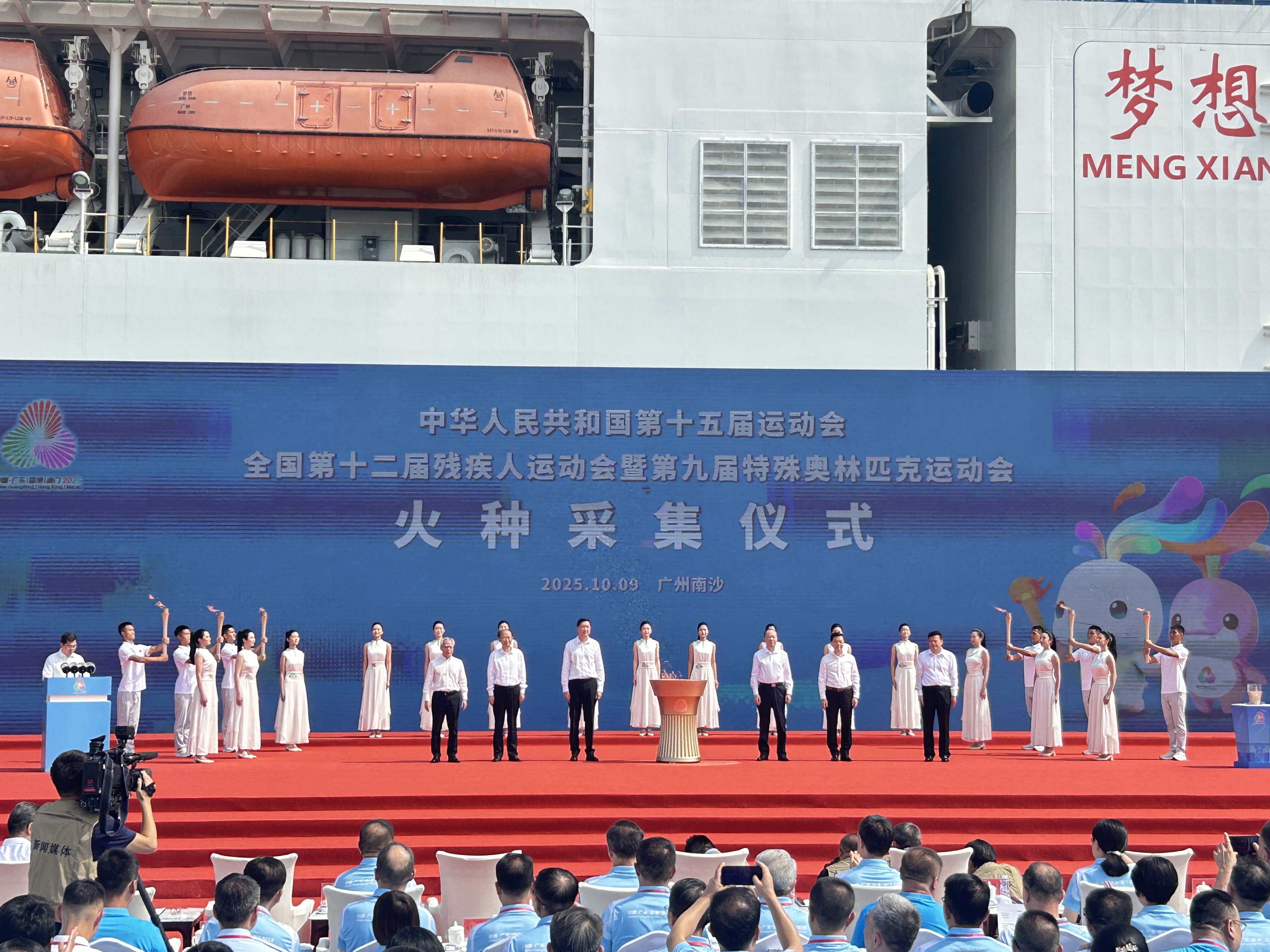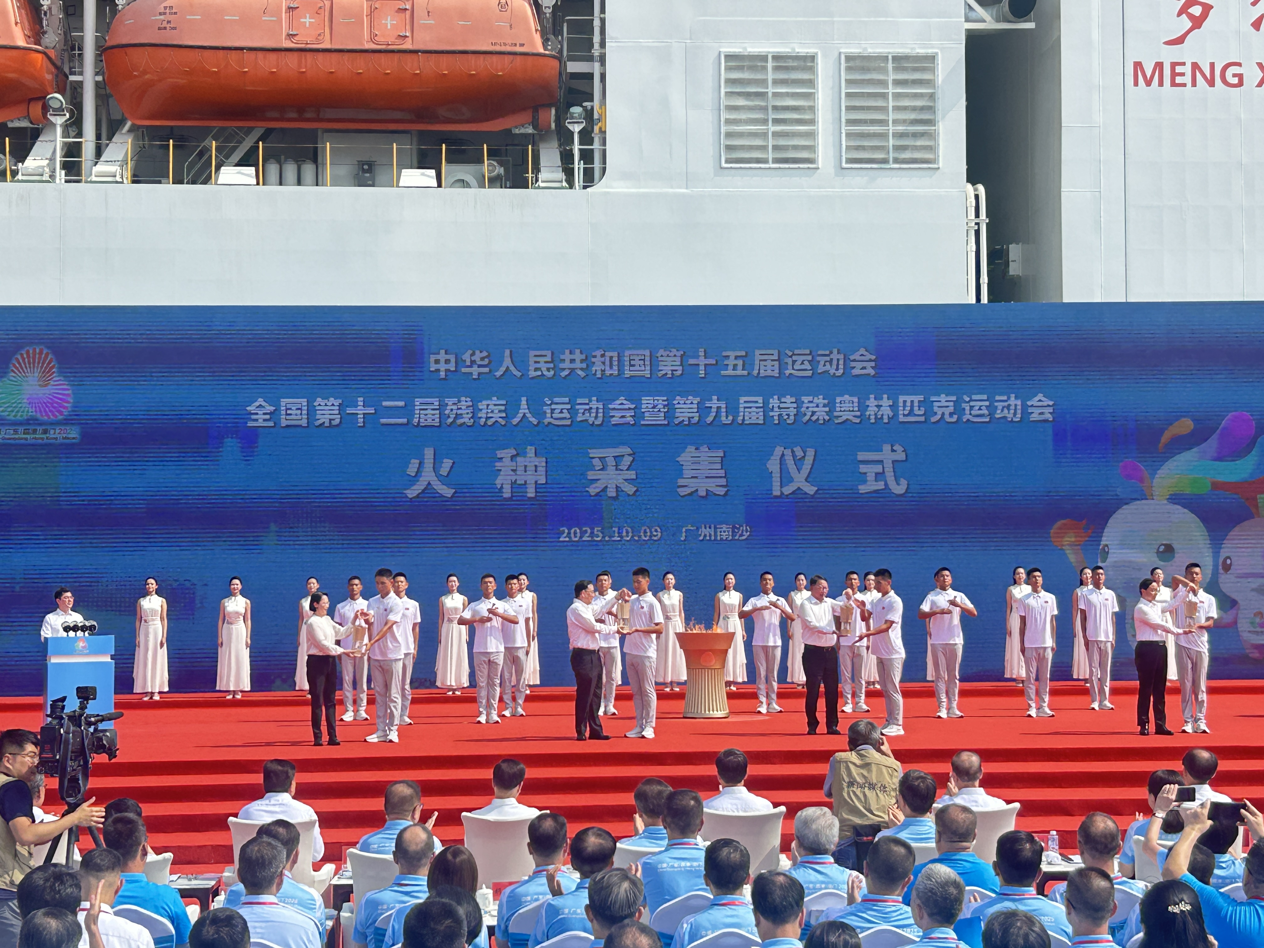 (大公文匯網 記者 敖敏輝)9日上午,以中國「夢想」號大洋鑽探船為背景,第十五屆全國運動會和全國第十二屆殘疾人運動會暨第九屆特殊奧林匹克運動會火種採集儀式在位於南沙的廣州海洋地質調查局科考碼頭舉行。香港特別行政區行政長官李家超參與共同點燃十五運會和殘特奧會火種盆,政務司司長陳國基代表香港賽區受領火種。