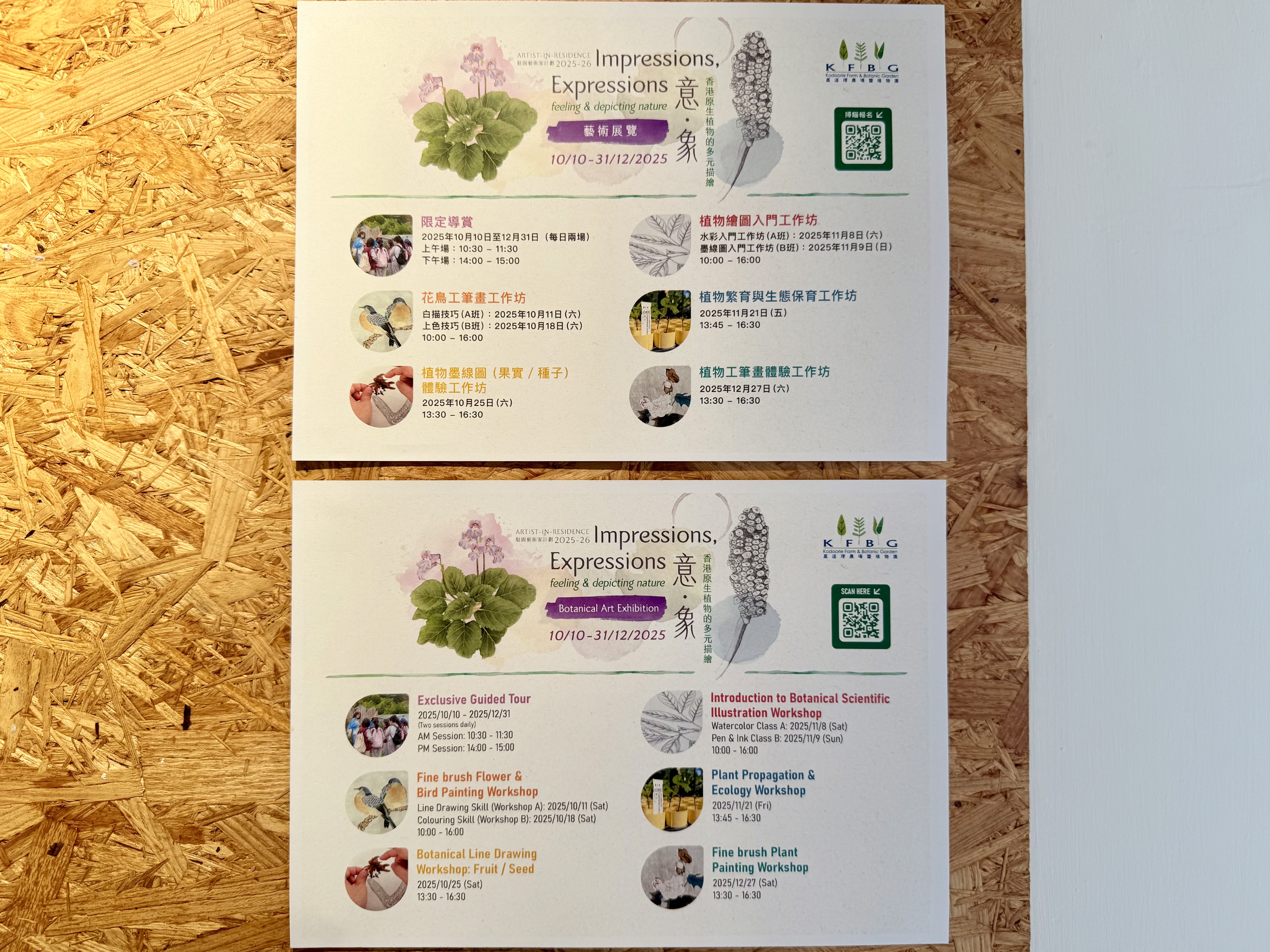 李敏貞與楊偉江亦會親自教授一系列限定工作坊課程,包括植物墨線圖(果實/種子)體驗工作坊、植物繪圖入門工作坊、花鳥工筆畫工作坊等,公眾可與藝術家交流,學習結合科學與藝術的植物觀察之道。