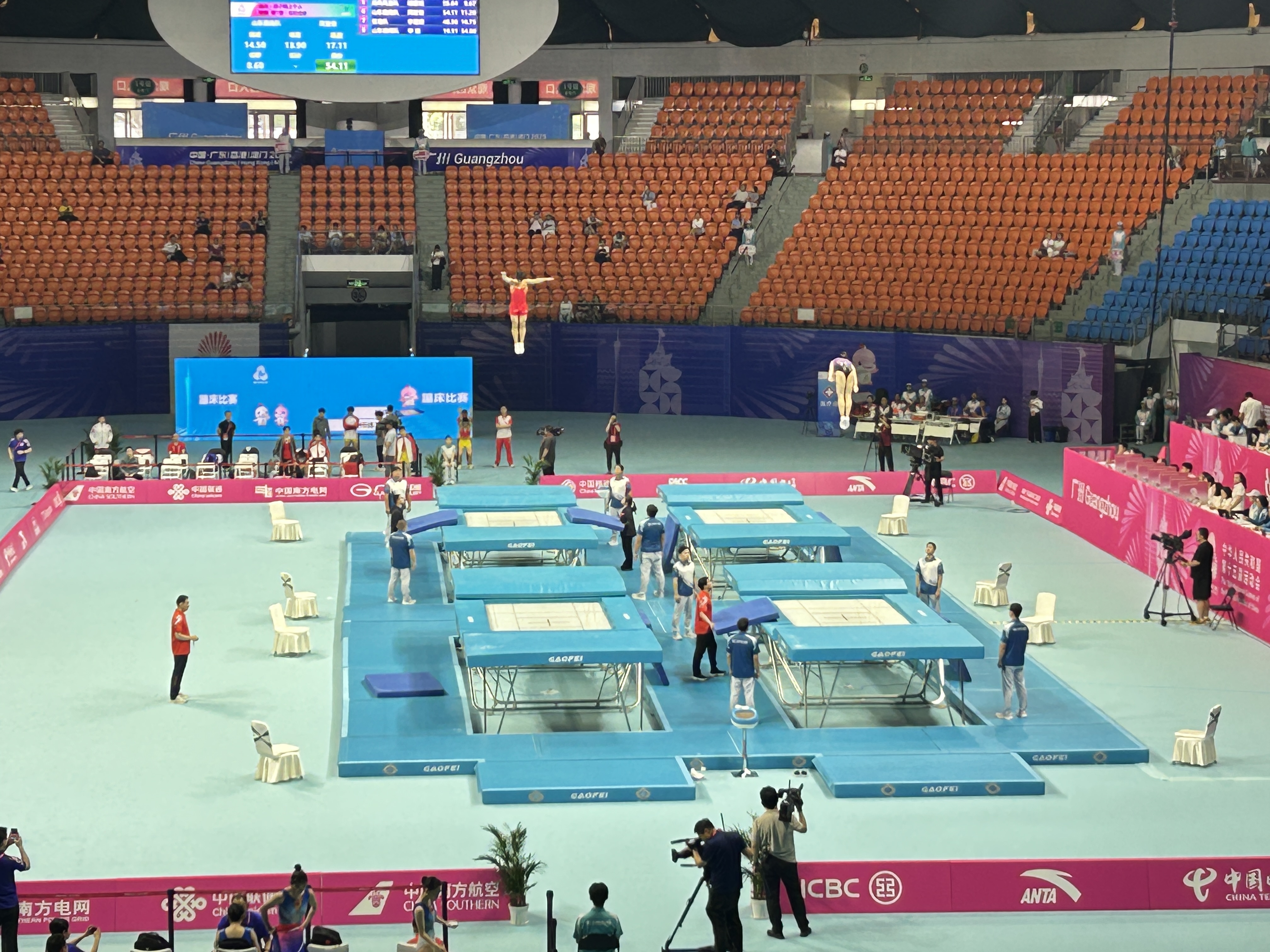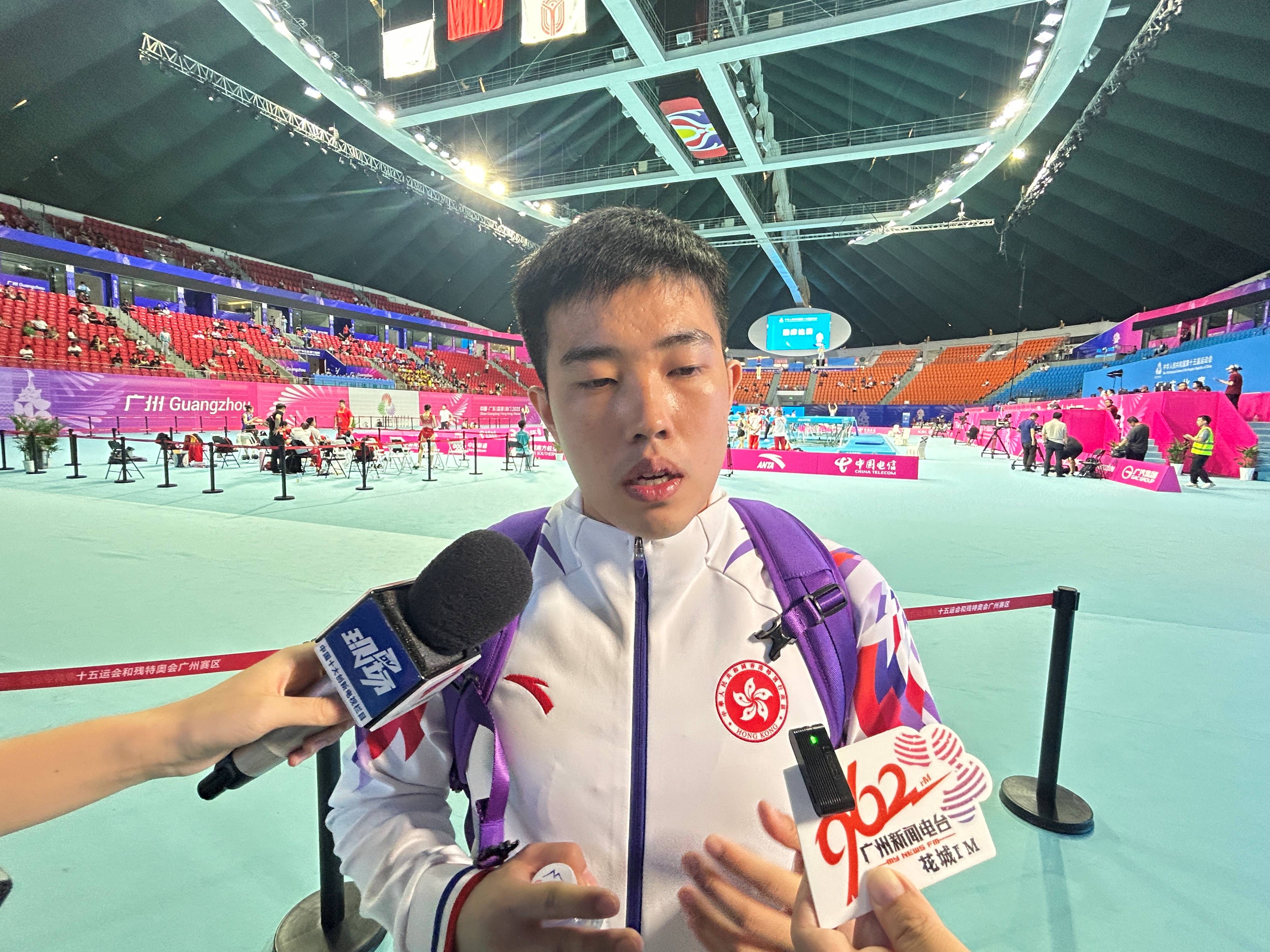李冠緯介紹,和香港本地的蹦床比賽相比,十五運會賽場的設施先進、場地大,觀眾也很多,在這裏比賽非常享受。