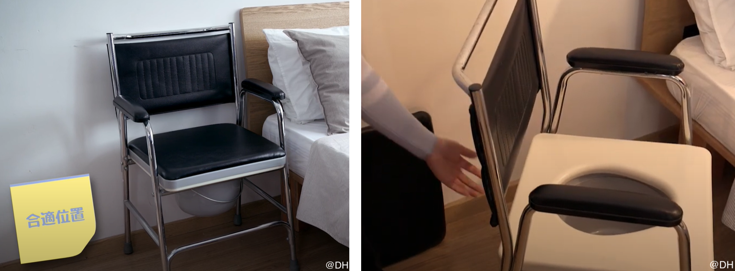 便椅擺放位置對便利性及安全性甚為重要。一般建議將便椅靠牆擺放,與床鋪呈九十度角,方便長者起身及坐下時保持平衡,具體擺放方案應依個別長者的能力以及家庭環境作適當調整。