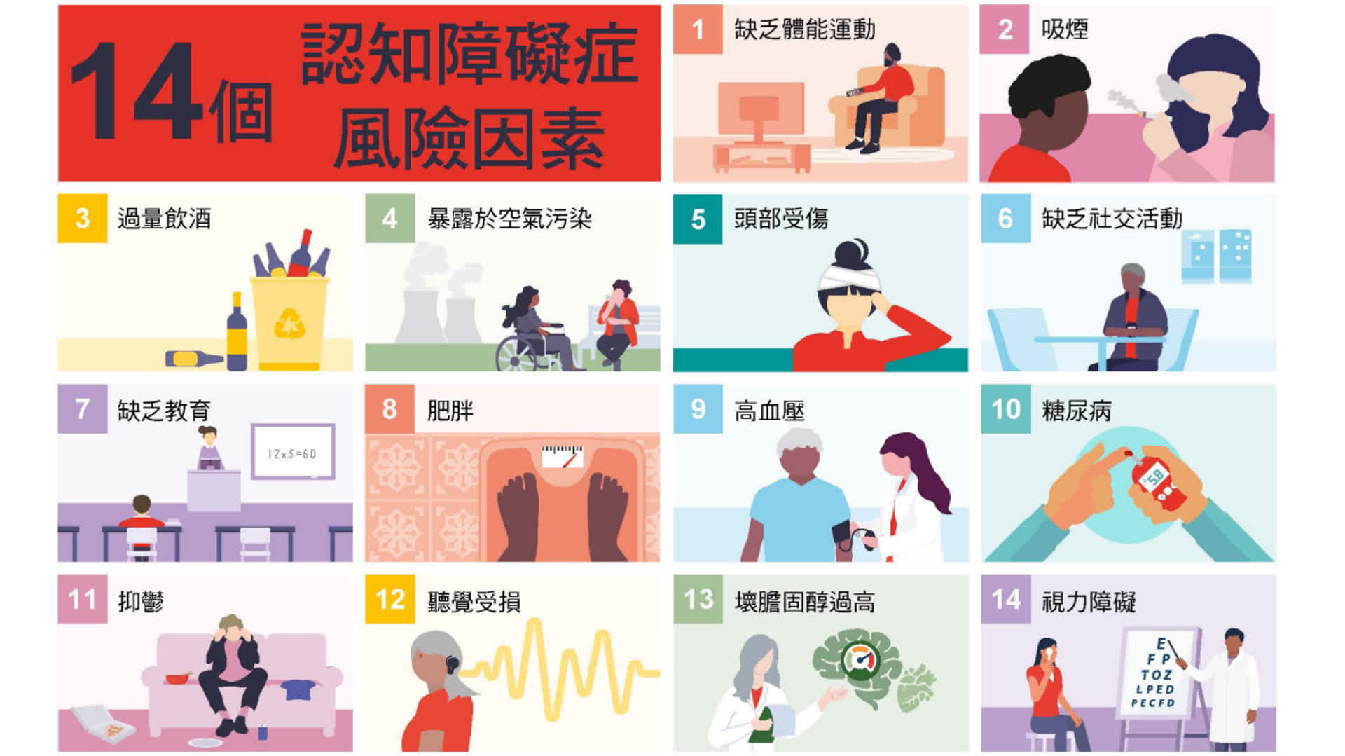 研究指出,認知障礙症與不良生活習慣、常見的健康問題和慢性疾病以及其他特定風險因素有關。透過集中處理14項可改變的認知障礙症風險因素,估計近半數認知障礙症是可預防的。