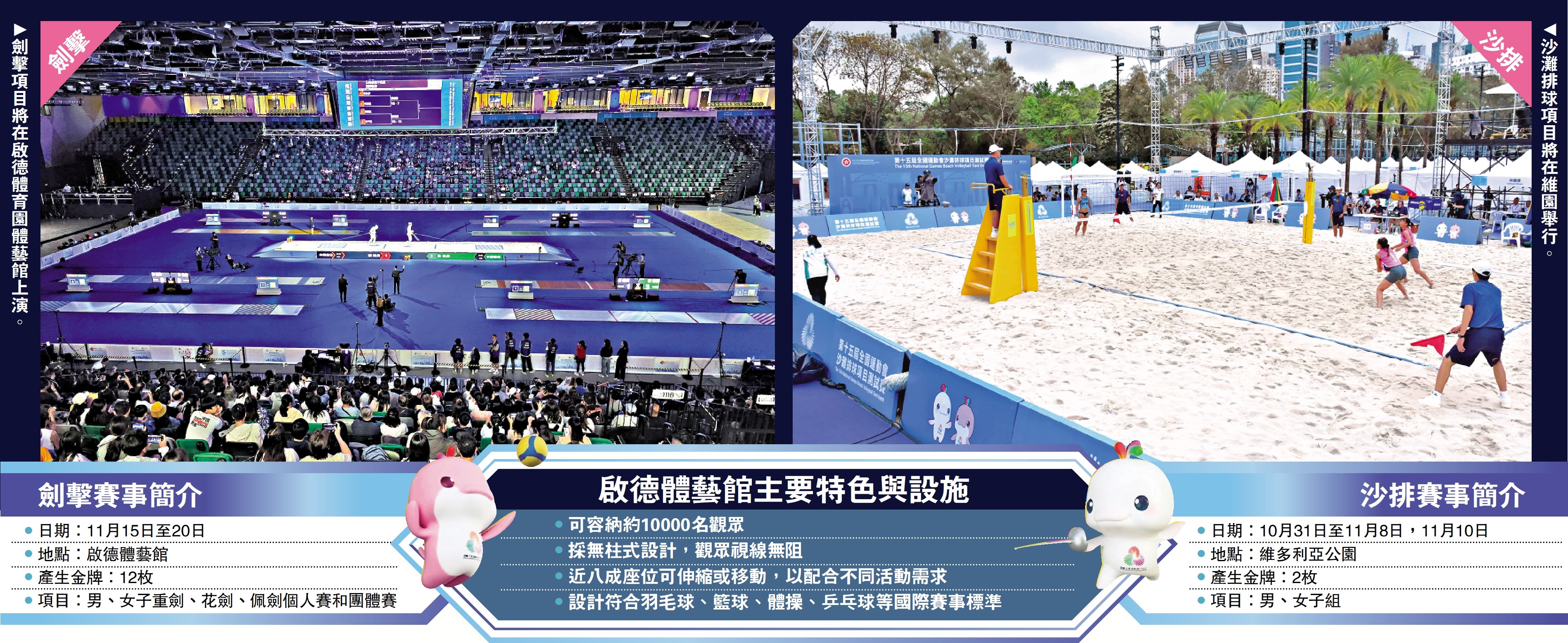 (大公報記者 張銳)第15屆全運會將於11月9日開幕。香港賽區將主辦8個項目:劍擊、沙灘排球、手球、U22男子籃球、七人欖球、高爾夫球、場地單車及三項鐵人,並分別在7個比賽地點競逐。即日起《大公報》將推出「香港賽區檢閱」系列,全面檢閱港隊在8個主場項目的實力,以及介紹各場館與比賽地點。作為系列頭炮,人氣最高、將在運動新地標啟德體藝館衝金的劍擊隊,將聯同破天荒在銅鑼灣維多利亞公園新場地力爭佳績的沙排隊,率先登場。