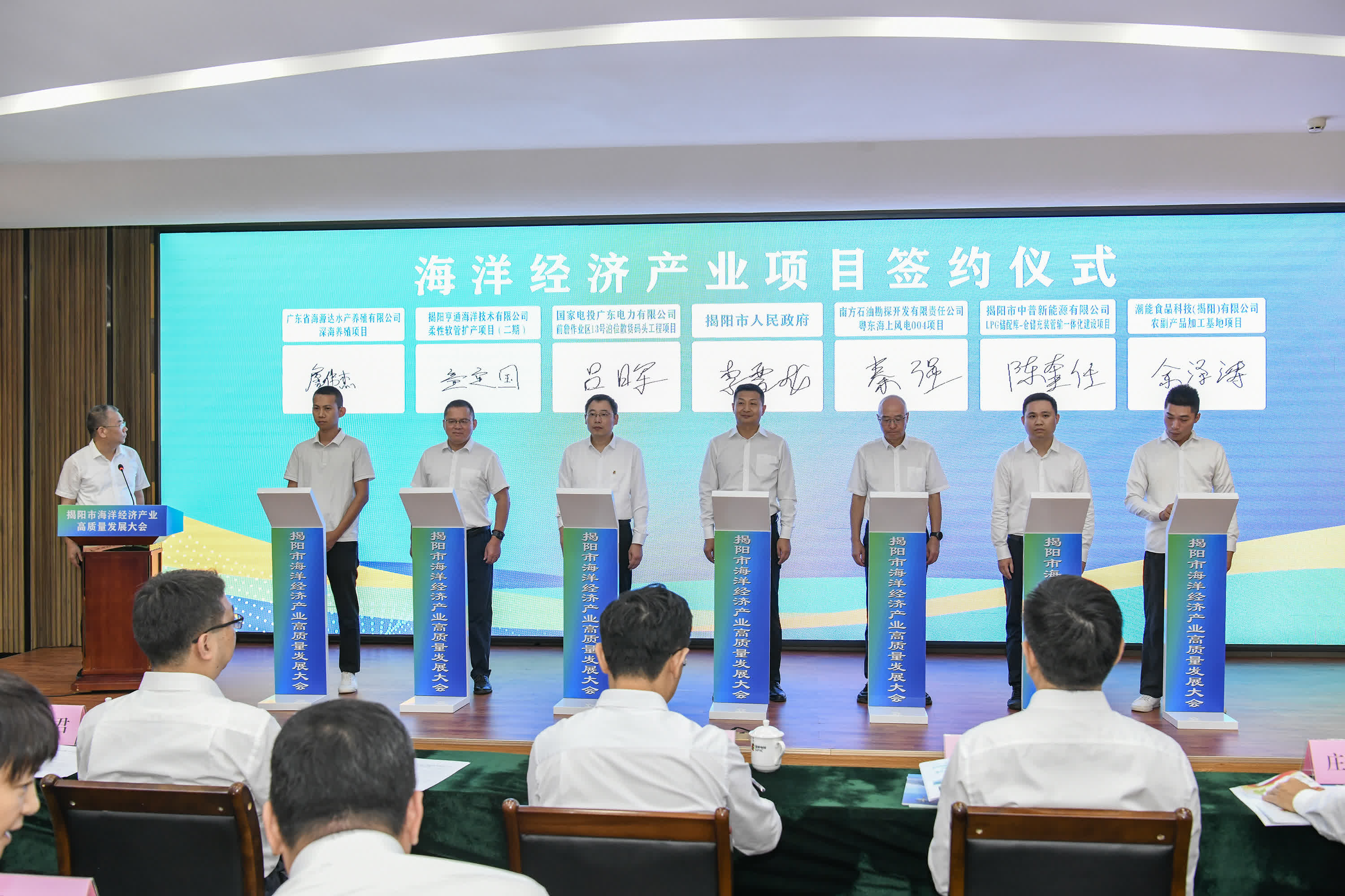 大會現場開展揭陽市海洋經濟產業招商推介,舉行海洋經濟產業項目集中簽約儀式,集中簽約海洋經濟產業項目15個,總投資189億元,涉及海上風電、港口建設、海工裝備、深海養殖等多個領域,以進一步激活「藍色引擎」,推進開放合作,加快建設現代海洋經濟發展高地。