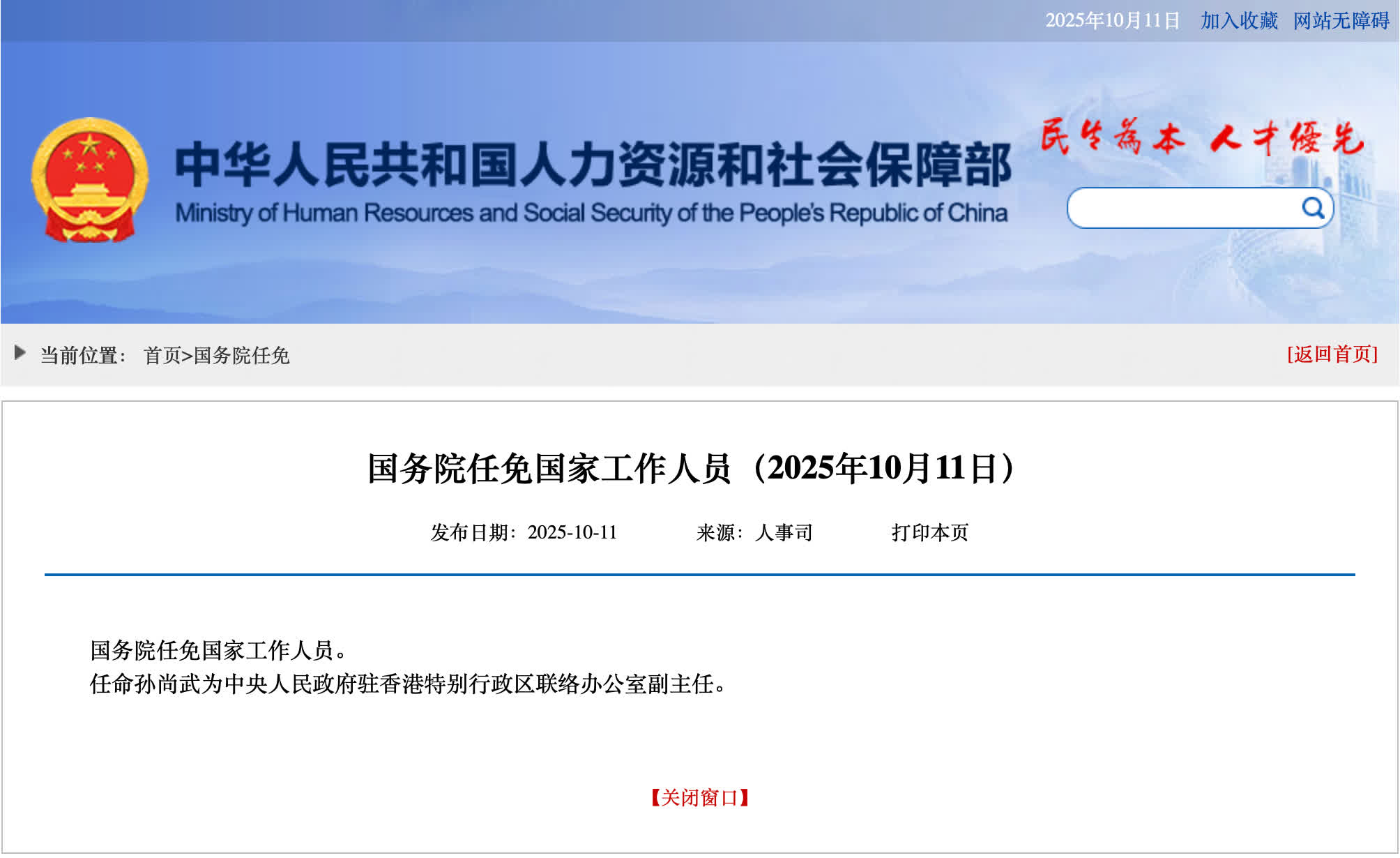 人社部網站10月11日消息,國務院任免國家工作人員: