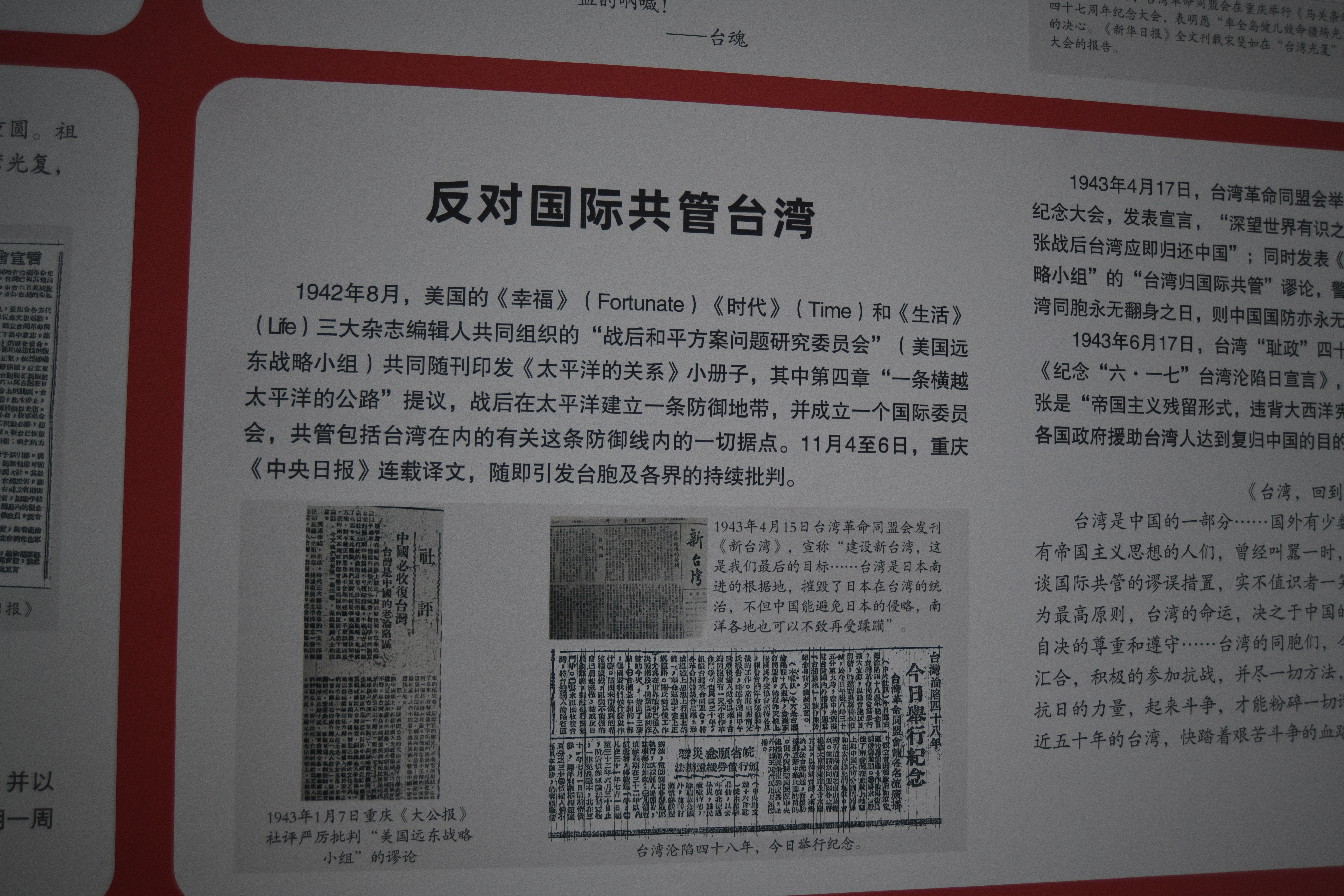 該展覽通過450餘張歷史照片和3.5萬餘字的文字敘述,詳盡展示了16世紀初至1945年間,台灣所經歷的西方殖民主義者覬覦、明鄭復台、清朝建省、武裝抗日、反殖民文化抗日、少數民族抗日、抵抗「皇民化」、民眾呼喚祖國、回歸光復等重要歷史事件,讓民眾了解台灣同胞在反抗外敵殖民和抗日戰爭中與大陸同胞並肩作戰、共抵外辱的歷史。