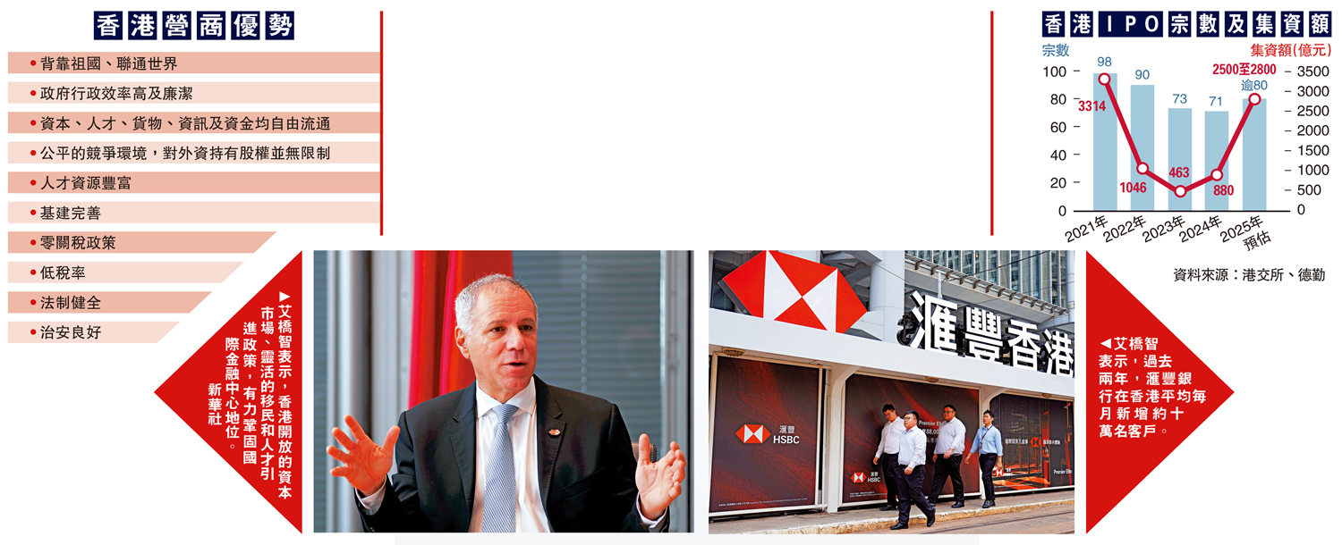 在艾橋智看來,香港開放的資本市場、靈活的移民和人才引進政策,持續吸引全球人才來港發展,有力鞏固了其國際金融中心的地位。他又預測,到2030年,香港有望成為全球最大的跨境財富管理中心。「愈來愈多國際及內地客戶正選擇香港作為資產配置平台。過去兩年,滙豐銀行在香港平均每月新增約十萬名客戶。」