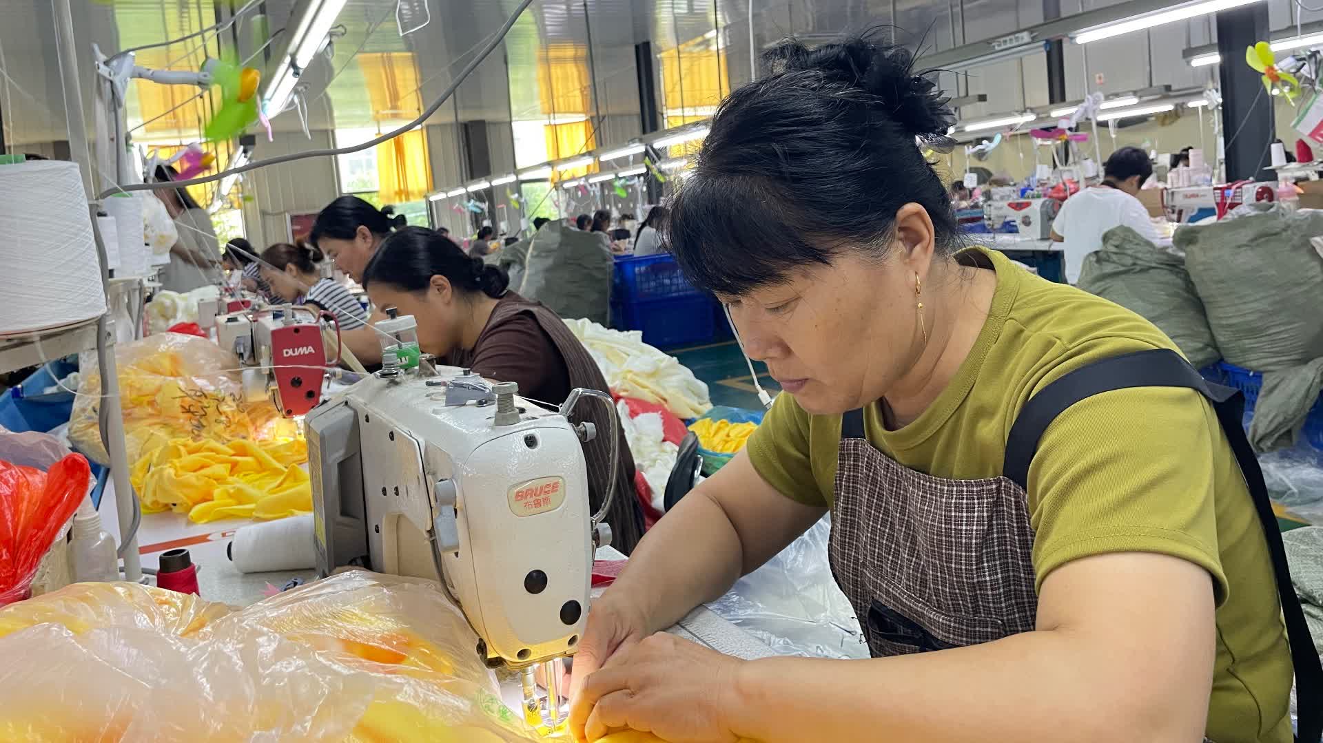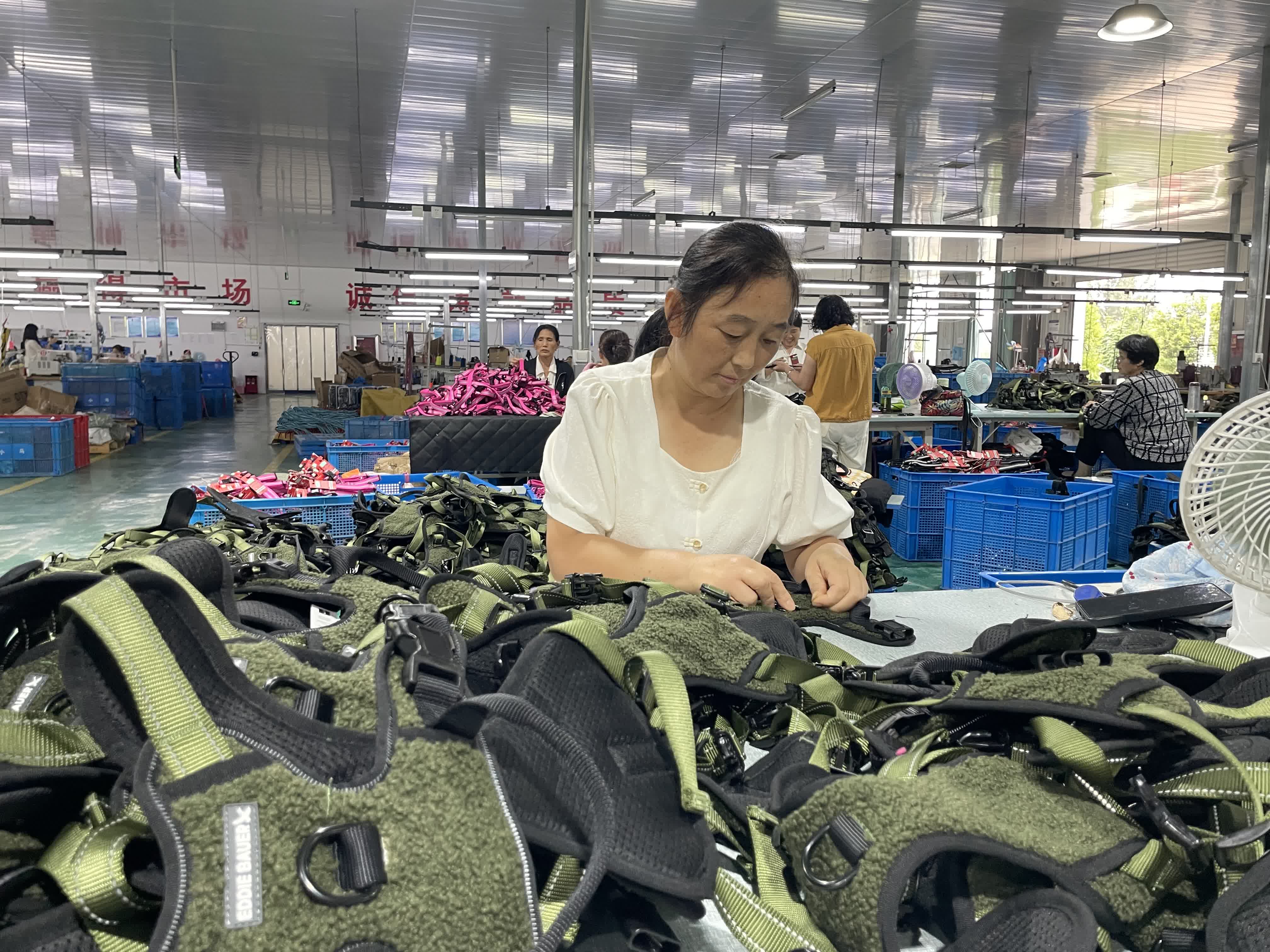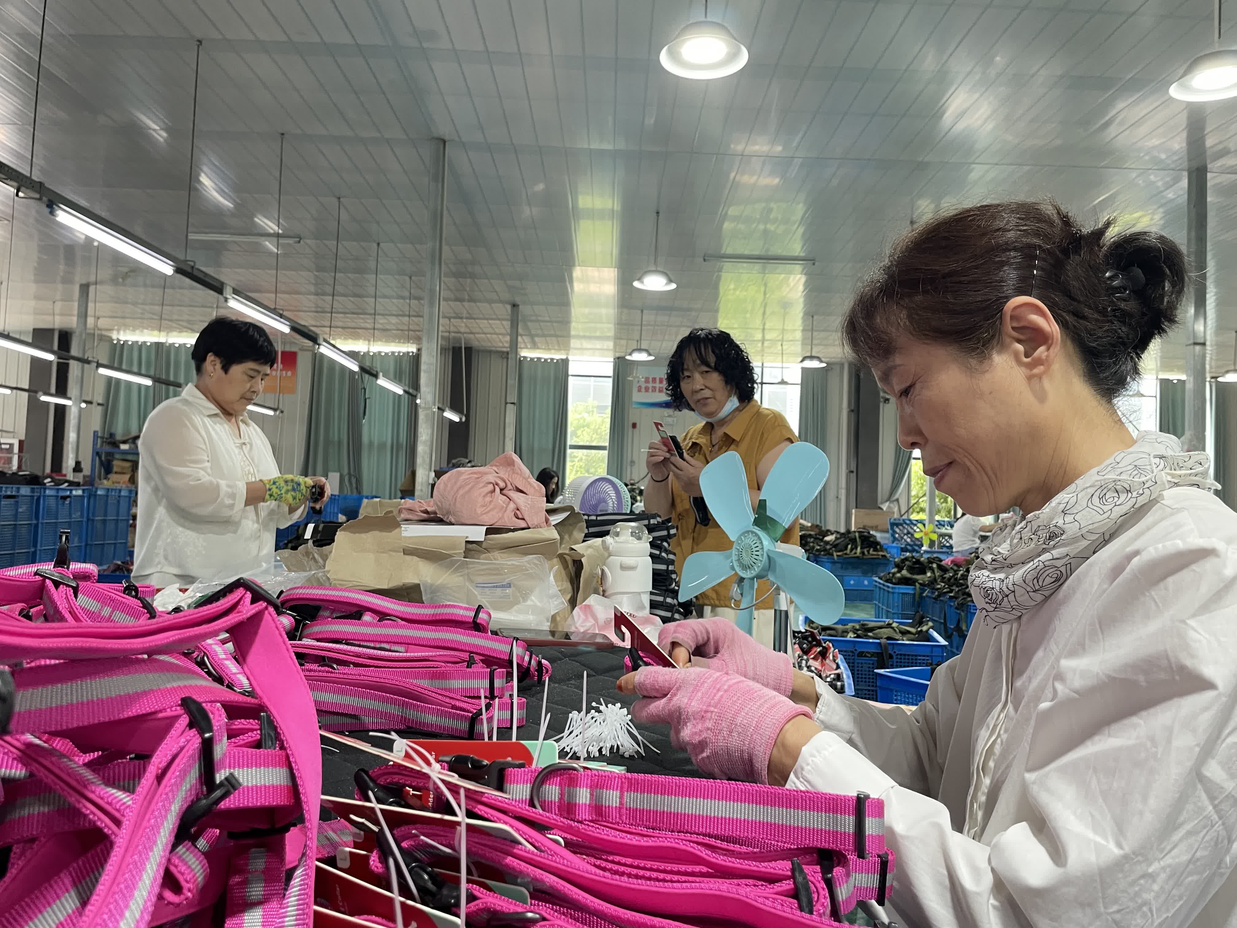不遠處的路宇寵物用品廠同樣忙碌。工人們巧手翻飛,將布料和尼龍繩變成各式寵物服裝和玩具,全部出口歐美國家。
