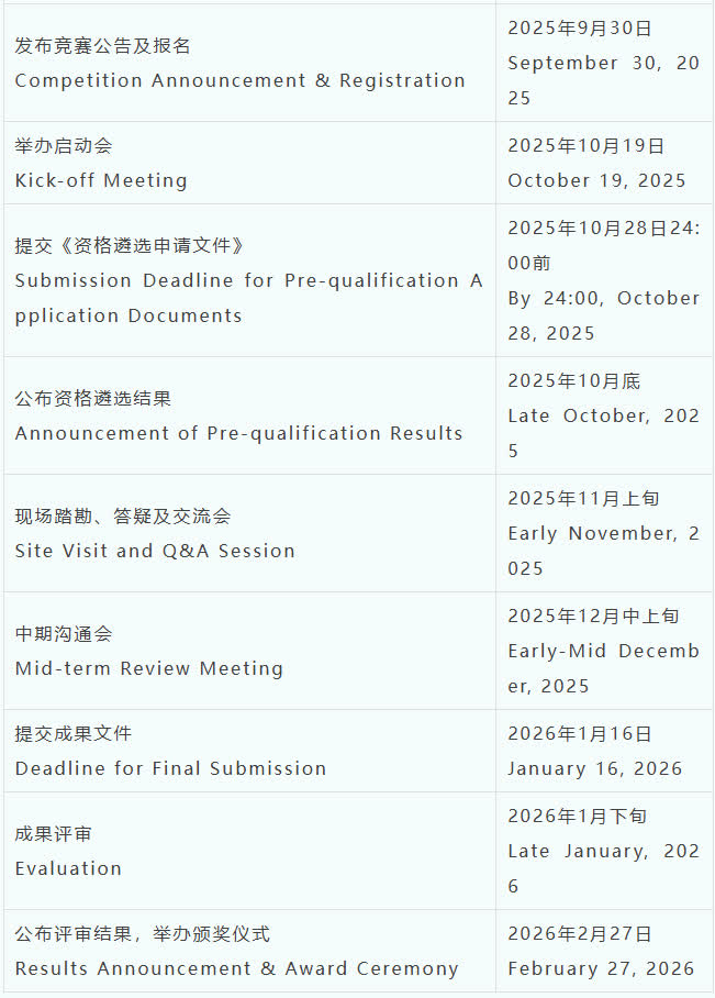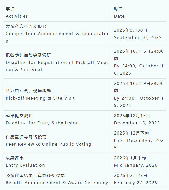 啟動會及現場踏勘報名時間:即日起至2025年10月16日24:00截止。以上兩項活動均無費用收取,請持續關注賽事訊息。