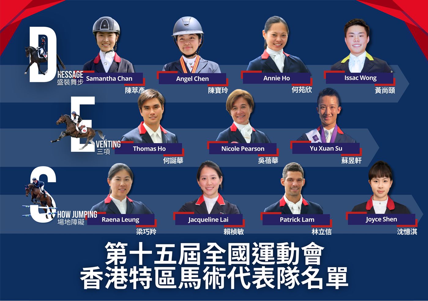 本屆共有11對人馬組合參與,陣容強大、創歷屆之最;代表隊將參與所有馬術項目賽事,包括參與盛裝舞步賽的陳萃彥、陳寶玲、何苑欣和黃尚頤;三項賽選手何誕華、吳蓓華和蘇昱軒,以及出戰場地障礙賽的賴楨敏、林立信、梁巧羚和沈憶淇。當中,林立信曾在2009年山東全運場地障礙個人賽封王,至今仍是港隊參加全運會以來,唯一非來自單車項目的金牌得主,今屆他將與馬匹Casillas Van De Helle聯手出戰。而新生代陳萃彥、陳寶玲、黃尚頤、蘇昱軒及沈憶淇,這次將迎來全運初亮相。