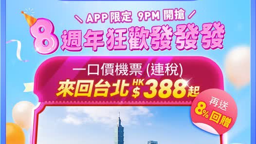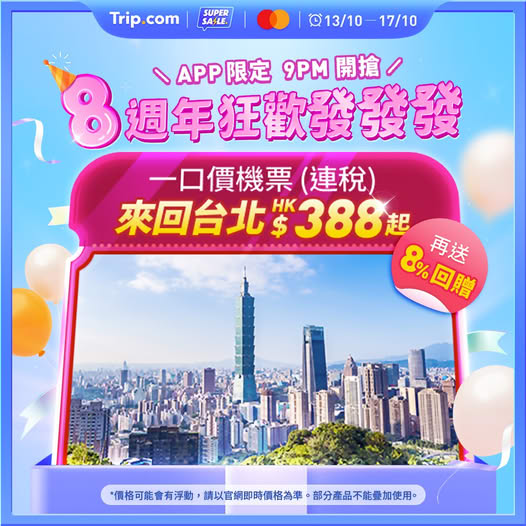 大公文匯全媒體報道,Trip.com推出一口價機票優惠,只要$388起就可以搭長榮航空飛台北。是次優惠活動分2個時間推出,今晚(13日)9時先推出一波$388來回優惠機票,半小時後再接再厲,晚9時30分則會推出$688來回優惠機票。