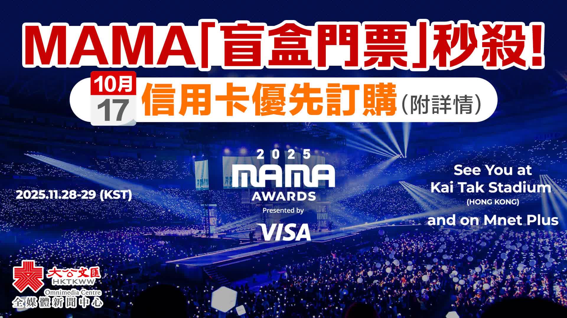 大會今日(13日)公布了本屆MAMA頒獎禮的票務詳情。門票將分兩階段發售,首階段為本周五(17日)的信用卡優先訂購,次階段為下周一(20日)的公開發售。票價共分9檔,分別為2599、2399、2299、2099、1699、1499、1299、1099及899港元。優先訂購僅限透過Cityline平台進行,而公開發售則將透過Cityline、大麥網、Trip及Qoo10等多個平台同步展開。另外,本屆MAMA的完整入圍名單將於本月16日透過Mnet節目正式公開。