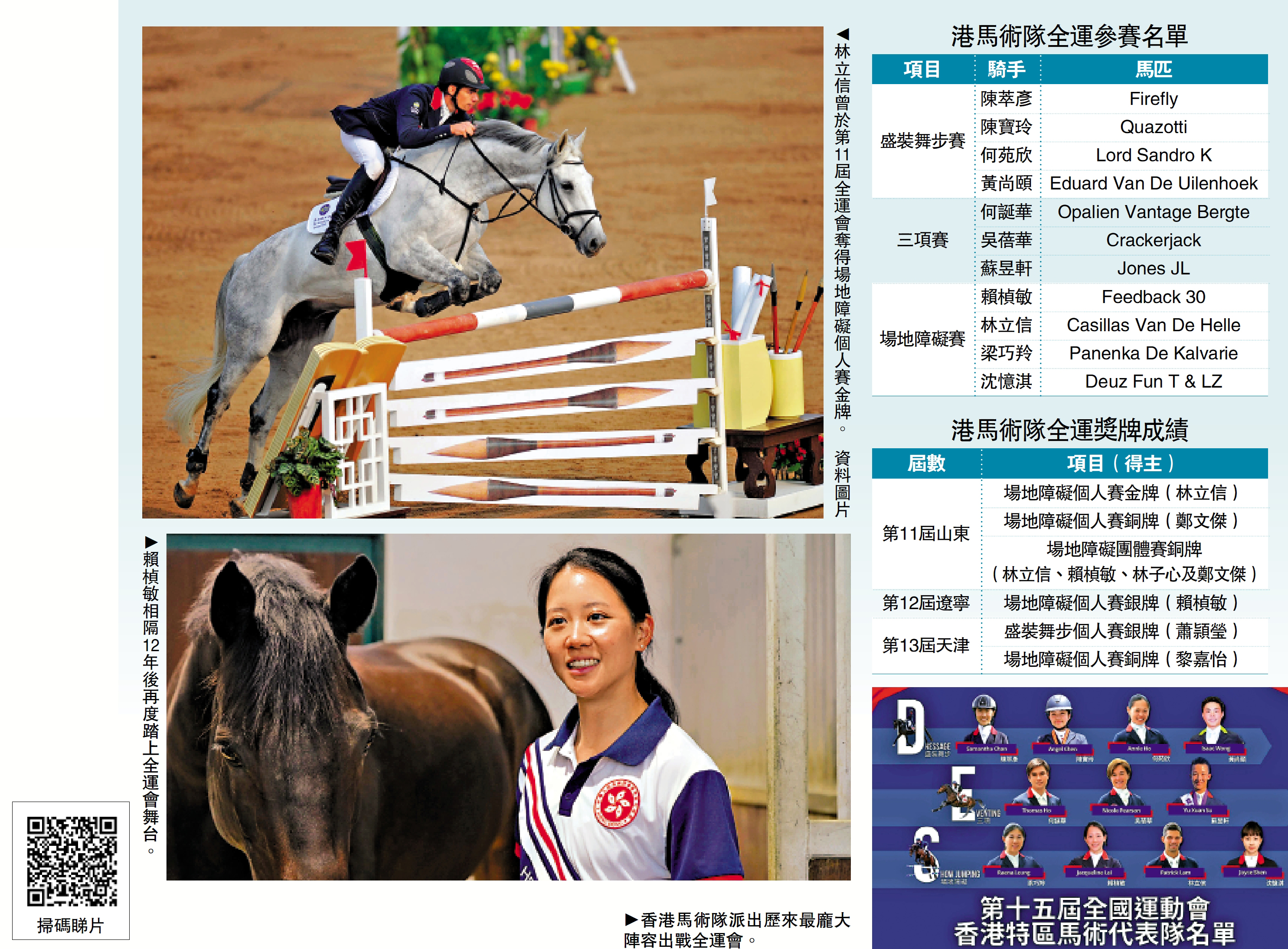 港隊歷來合共在全運會取得1金2銀3銅,當中本屆成員之一林立信,於2009年的第11屆全運會勇奪場地障礙個人賽金牌,成為港隊馬術首位在大型運動會中摘金的騎手。