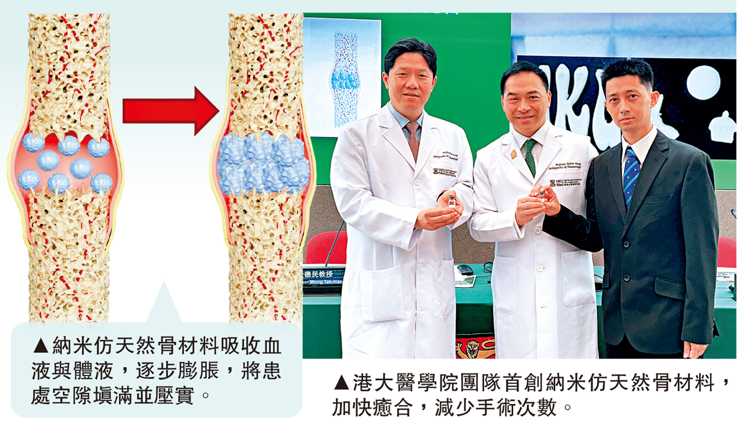(大公報記者 邱梓茵)香港醫療科技再有大突破,港大醫學院團隊聯合深港力量,歷時近十年研發「納米仿天然骨材料」,不僅在強度、韌性及彈性上大幅超越傳統人工骨,更具備與人體骨骼融合癒合的特性,有望為患者減少手術次數。該項目獲國家、粵港澳大灣區及深港兩地多項基金支持,目前已取得內地專利,下一步計劃先行在內地落地應用。
