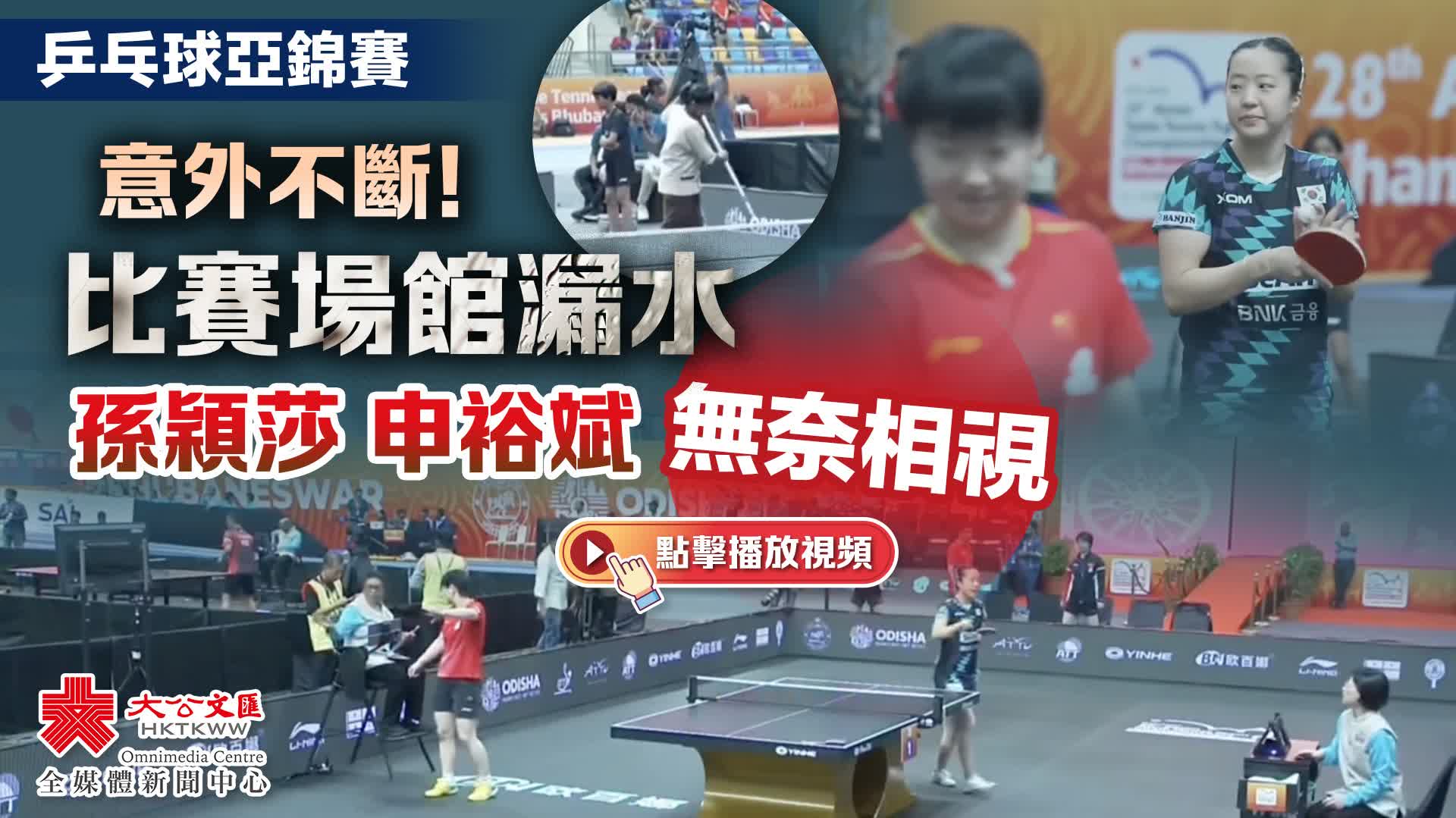 第一局由孫穎莎對陣韓國選手申裕斌,還沒開打就意外不斷。場館地面滿是水珠,應為場館漏水導致,孫穎莎找裁判反饋三次均無果,孫穎莎和申裕斌無奈相視,露出尷尬的笑容。過了許久,才有人員進來清潔。