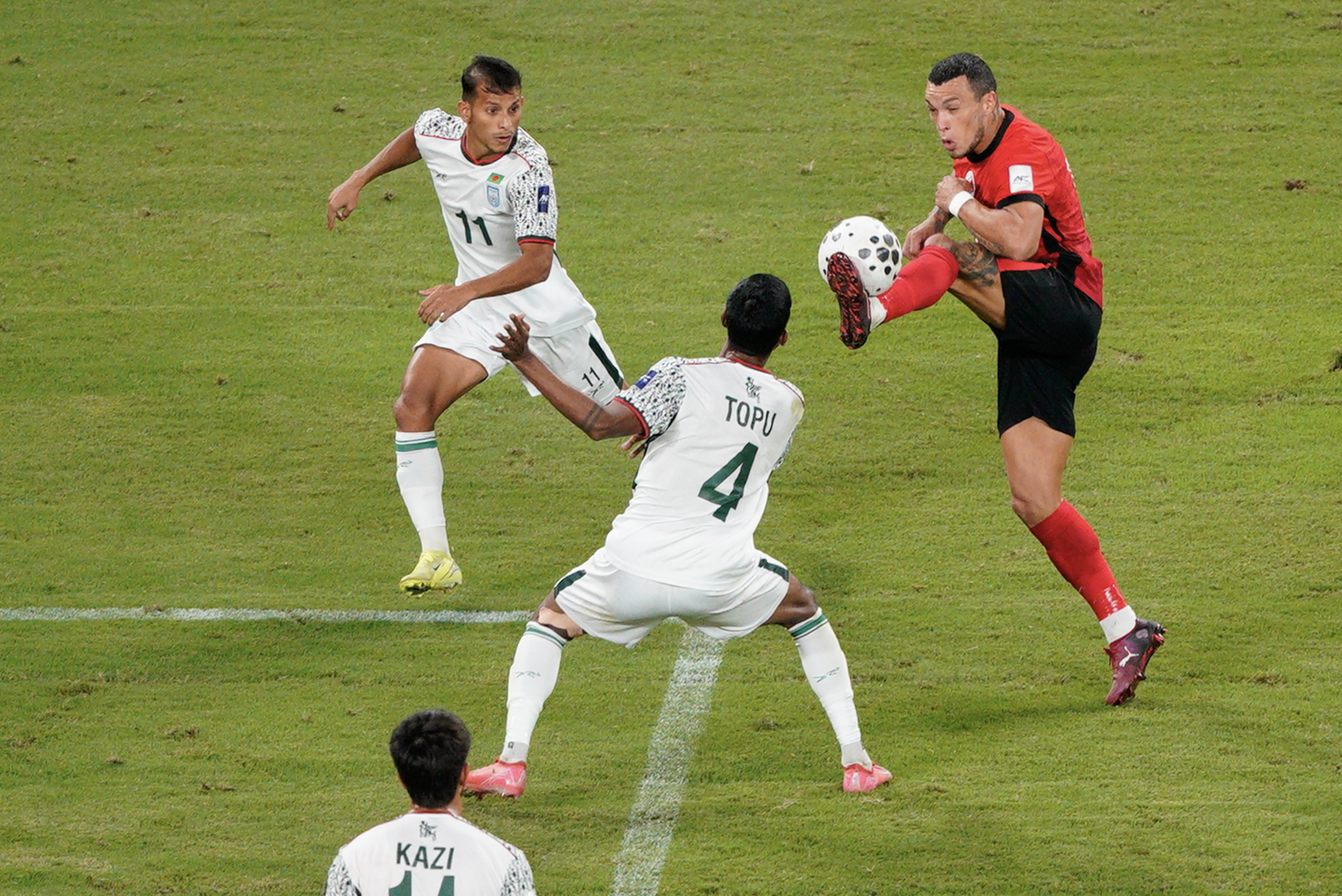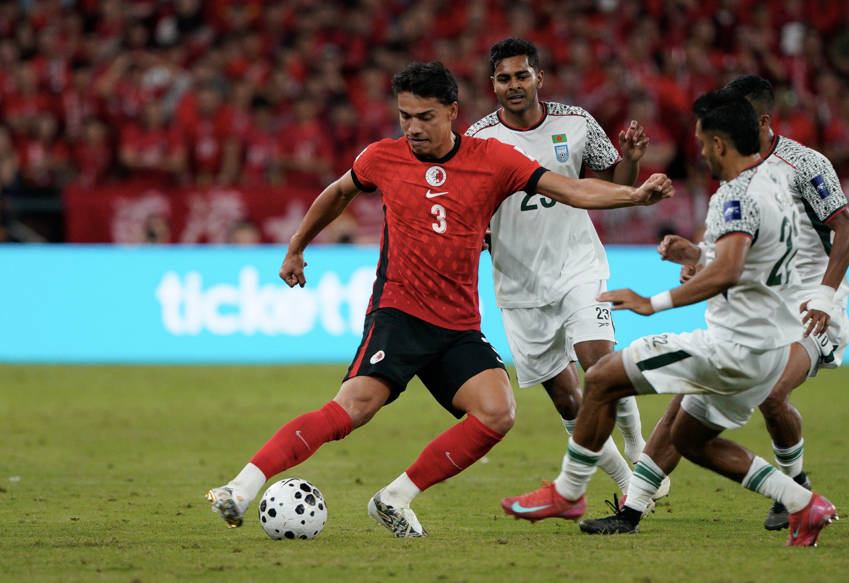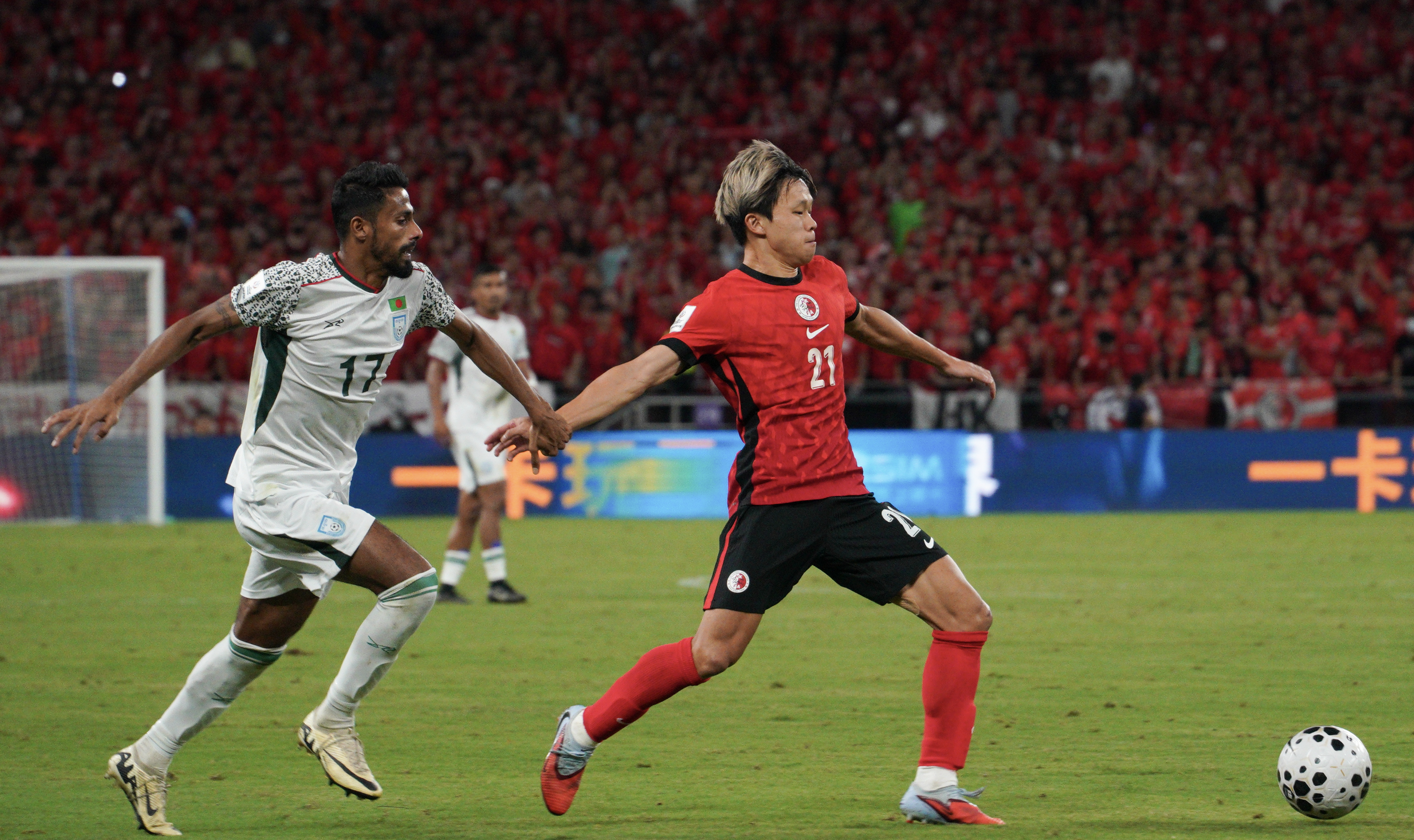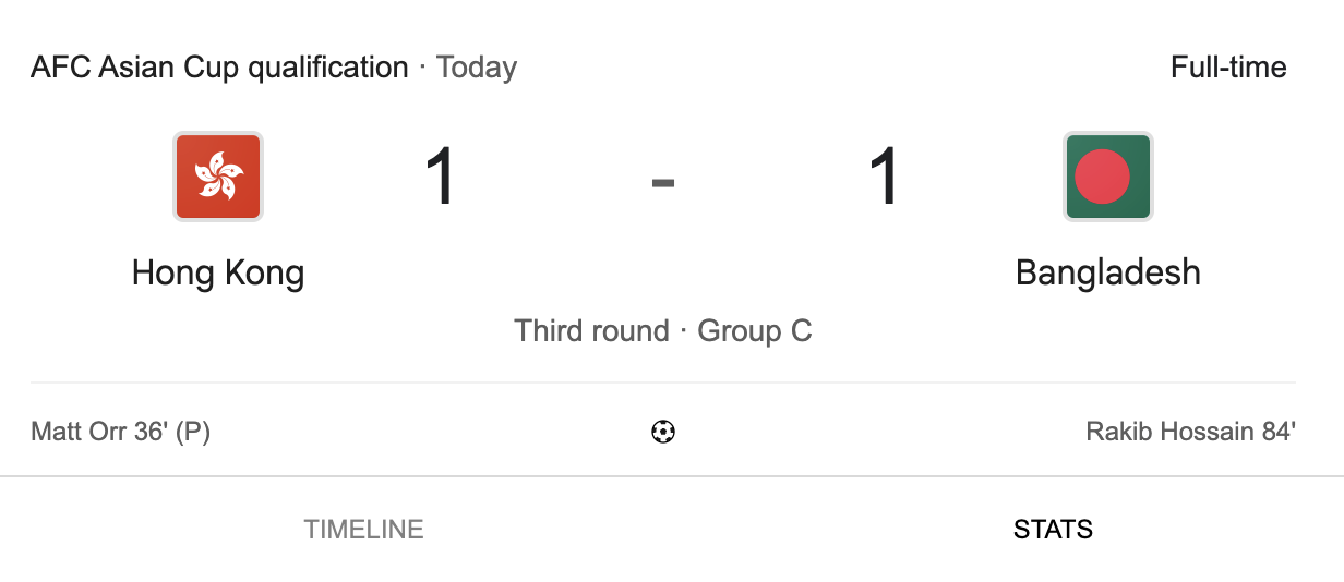 下半場補時6分鐘後,比賽最終以1∶1結束。目前港足共積8分。今屆亞洲盃外圍賽第三圈只得小組首名可以出線,港隊與孟加拉、印度和新加坡同組,早前曾作客賽和新加坡0∶0,於主場1∶0擊敗印度,後又作客4∶3反勝孟加拉,升上小組榜首,賽前累積7分。