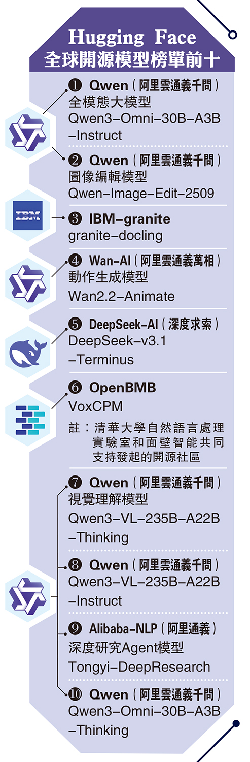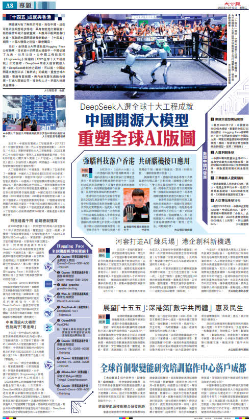 近日,全球最大AI開源社區Hugging Face公布榜單,排名前十的開源大模型中,中國佔據了九席。10月13日,由中國工程院院刊《Engineering》評選的「2025全球十大工程成就」正式發布,DeepSeek開源大語言模型入選,DeepSeek時刻光芒四射。可以說,中國的開源大模型正以「集群式」的崛起,重塑全球AI版圖。香港背靠祖國,與內地互聯互通融合發展,引進AI頭部公司、技術和人才,把握AI經濟黃金機遇。