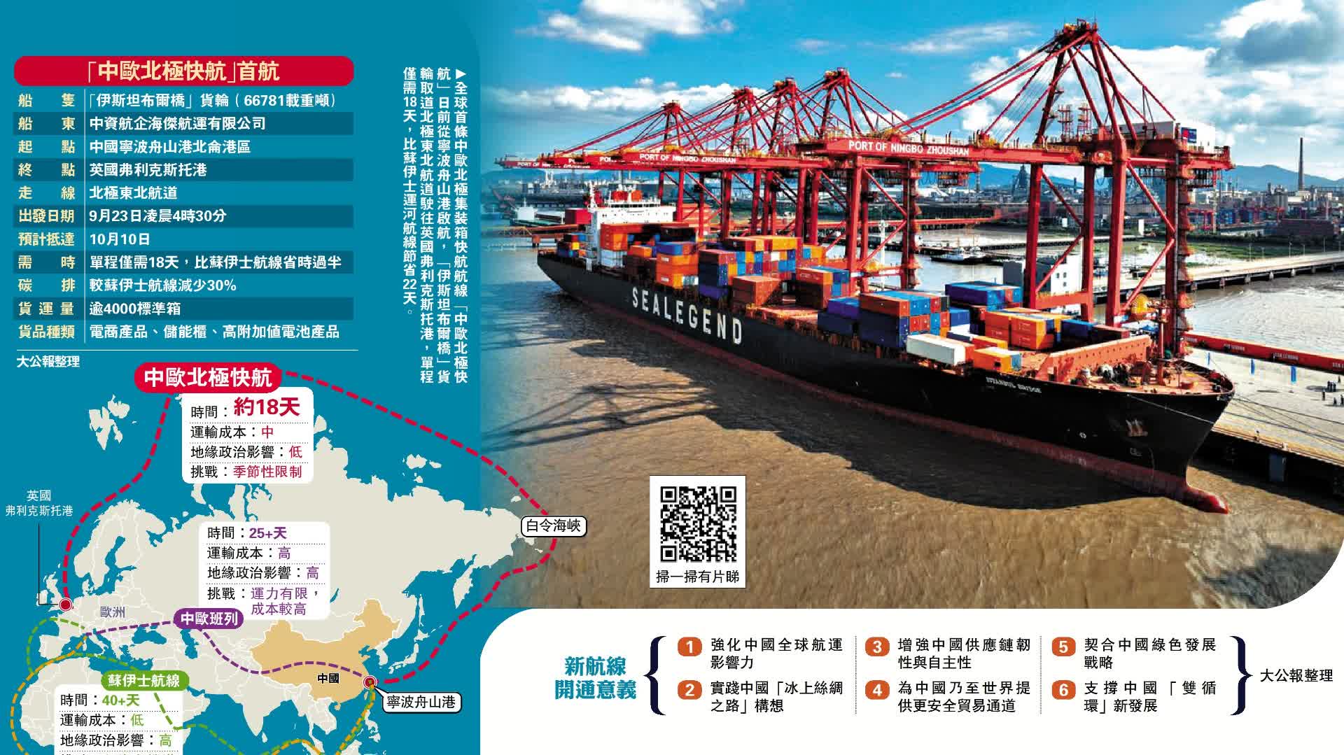 大公報綜合新華社、央視新聞、人民日報海外版報道:歷時20天,中歐北極集裝箱快航航線首艘貨船13日晚抵達英國費利克斯托港。該艘貨船從寧波舟山港出發,滿載約4000個標準箱,將陸續在英國、德國、波蘭和荷蘭的港口完成卸載作業。該航線的開通不僅體現了北極航道商業化運營的可行性,為全球貿易網絡提供了新的物流路徑選擇,使得亞歐之間的聯繫更加緊密、快捷,同時分散原有運輸通道的風險,增強中歐間供應鏈的韌性。