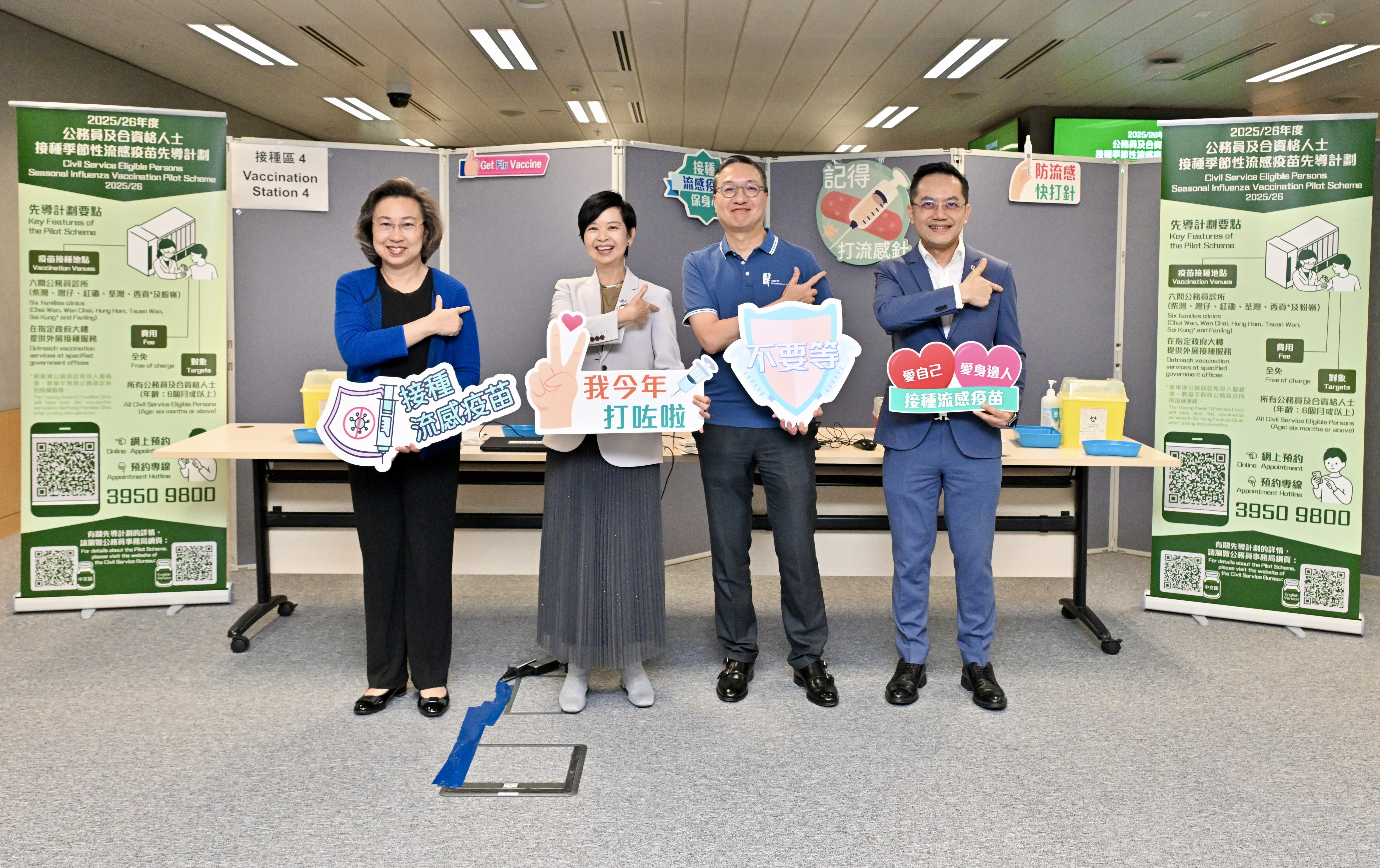 為方便和鼓勵公務員接種流感疫苗,公務員事務局聯同衞生署今年繼續推行公務員及合資格人士接種季節性流感疫苗先導計劃,並首次以試點形式在指定政府辦公大樓提供外展接種服務。約110名公務員及合資格人士於十月十五日上午在政府總部透過外展站接種流感疫苗。