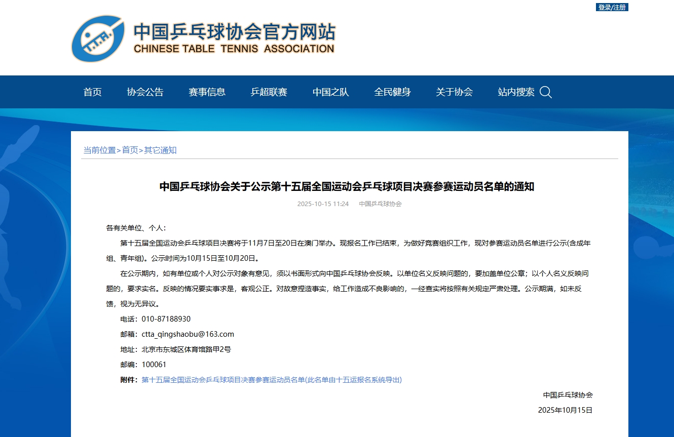 大公文匯全媒體報道,10月15日,中國乒乓球協會正式公布了第十五屆全國運動會乒乓球項目決賽階段的參賽運動員名單。馬龍、樊振東、王楚欽、陳夢、孫穎莎等國乒主力選手均位列其中。