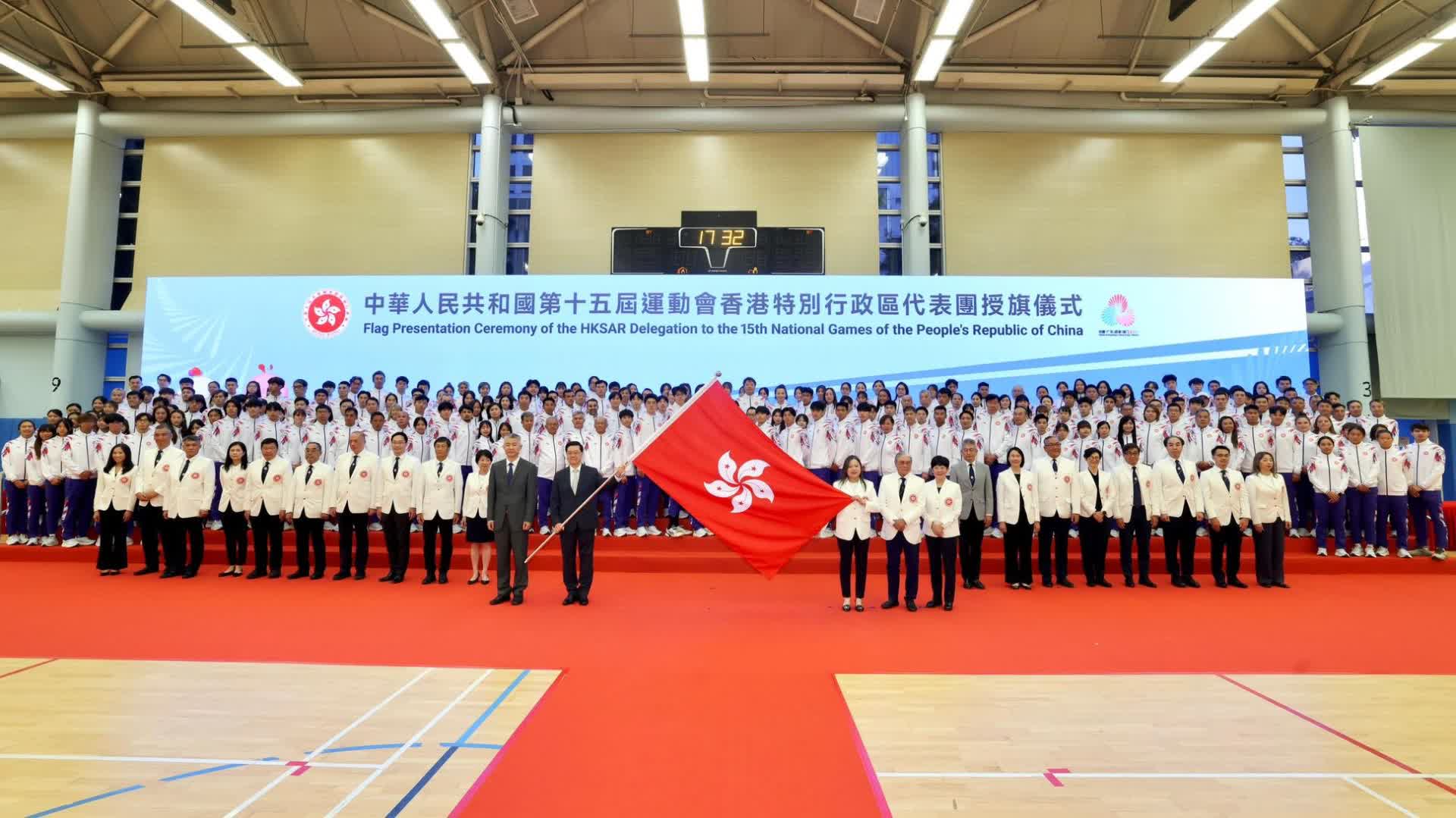 李家超於社交平台發文指,很高興主持十五運會香港特區代表團授旗儀式,向文化體育及旅遊局局長兼香港特區代表團團長羅淑佩授予香港特區區旗,為將於下月出戰十五運會的香港特區代表團成員打氣助威。