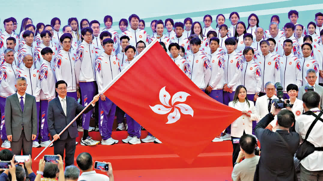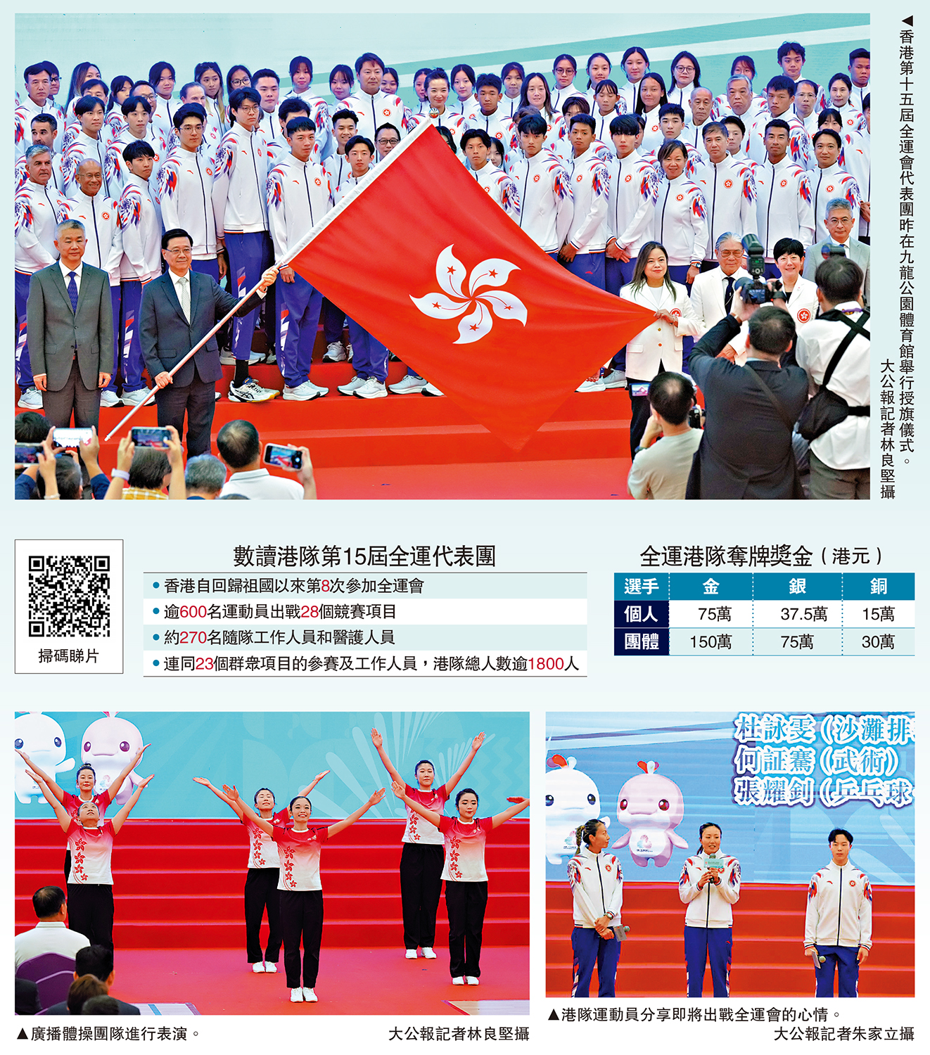 (大公報 記者 朱家立)由粵港澳三地合辦的第15屆全運會將於11月9日開幕,香港代表團昨日在九龍公園體育館舉行授旗儀式,行政長官李家超向香港代表團授旗。本屆全運會港隊總參賽人數逾1800人,是歷屆之最,當中包括出戰28個競賽項目的逾600名運動員。文化體育及旅遊局局長兼港團團長羅淑佩表示,香港賽馬會將「賽馬會優秀運動員獎勵計劃」的原來預算上調百分之五十,全運會個人項目的金牌獎金增至75萬元,團體項目的金牌獎金增至150萬元。