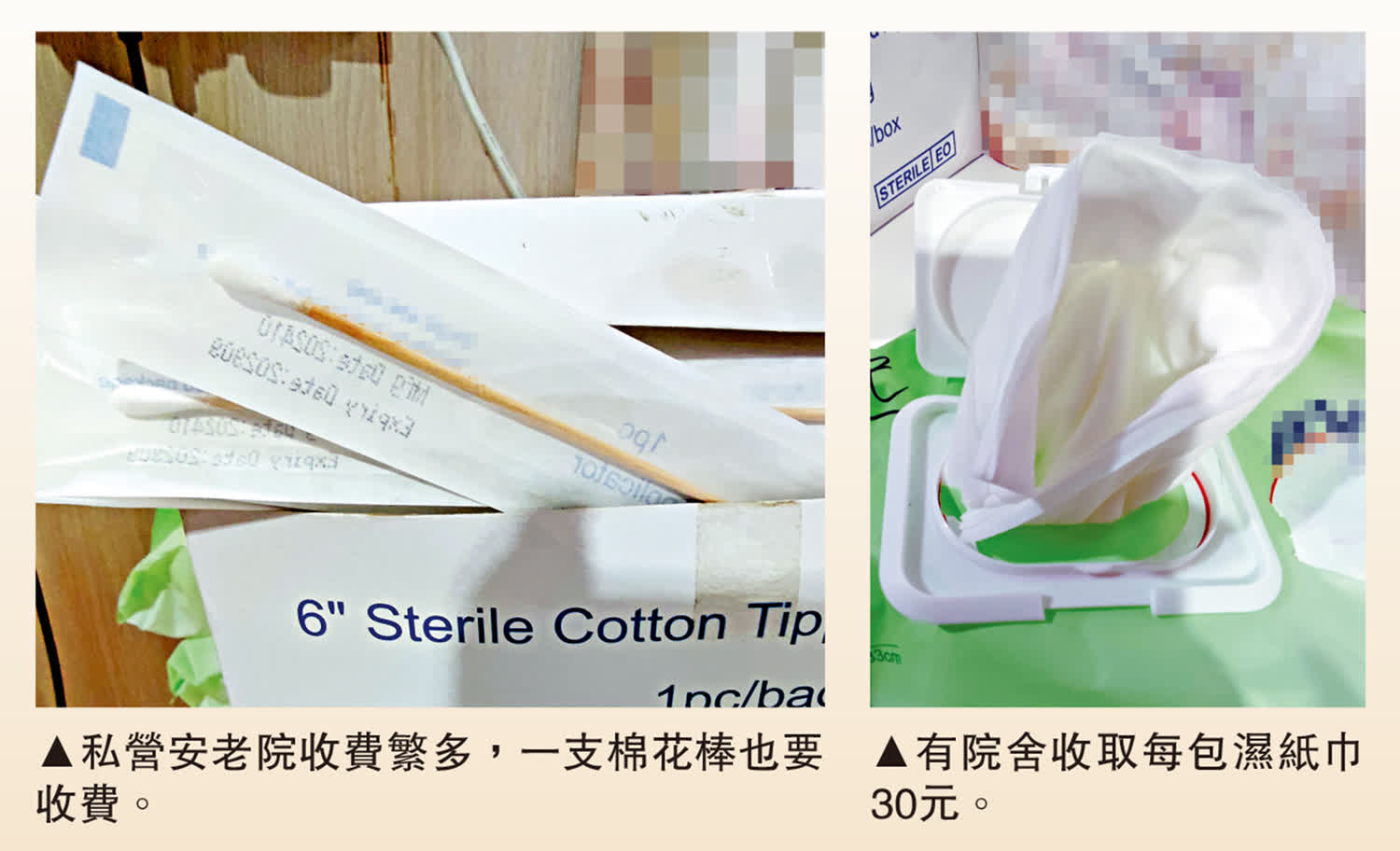 大公報記者日前在新界區一間私營院舍調查時發現,職員只是介紹該院的收費便用了近一小時,近百個收費項目中,除了房租、醫療用品及服務、冷氣費和陪診費等基本費用外,連手機和收音機需充電的用品,每月亦需額外收取60元電費。此外,代購消毒酒精棉每100片收費40元,手套一盒66元。有院舍更連沐浴液亦要收費。對於一位行動能力尚可但需要定期覆診的長者而言,入住該私營院舍的每月最低消費至少為約16000元。