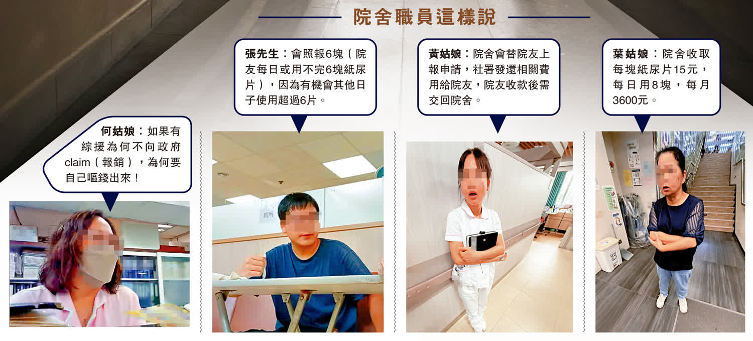 「可以向政府拿足,最重要是政府批多少,就可取回多少。」同區另一間院舍職員鍾先生亦向到來的記者如此介紹,他指該院收取紙尿片費用每月約3600元,如沒有申領綜援金就以每日6片起計,即每月費用為2700起。