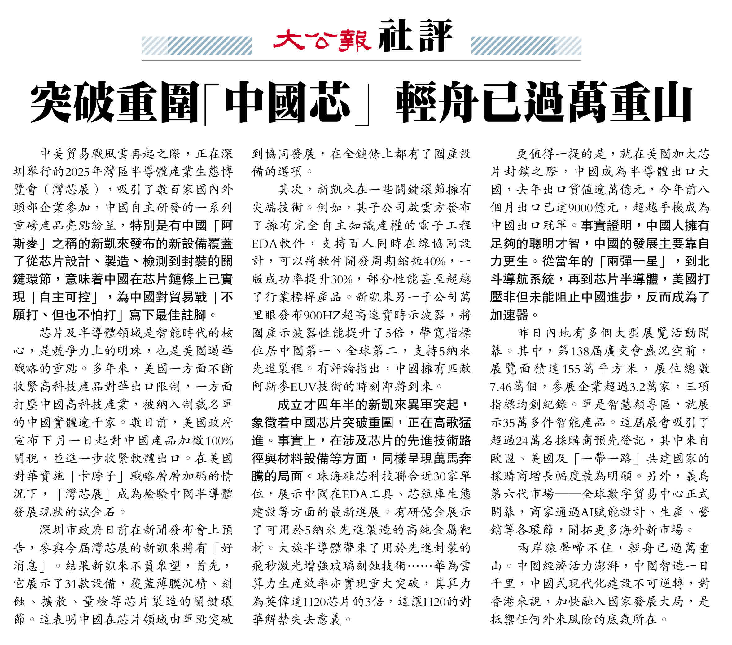 中美貿易戰風雲再起之際,正在深圳舉行的2025年灣區半導體產業生態博覽會(灣芯展),吸引了數百家國內外頭部企業參加,中國自主研發的一系列重磅產品亮點紛呈,特別是有中國「阿斯麥」之稱的新凱來發布的新設備覆蓋了從芯片設計、製造、檢測到封裝的關鍵環節,意味着中國在芯片鏈條上已實現「自主可控」,為中國對貿易戰「不願打、但也不怕打」寫下最佳註腳。
