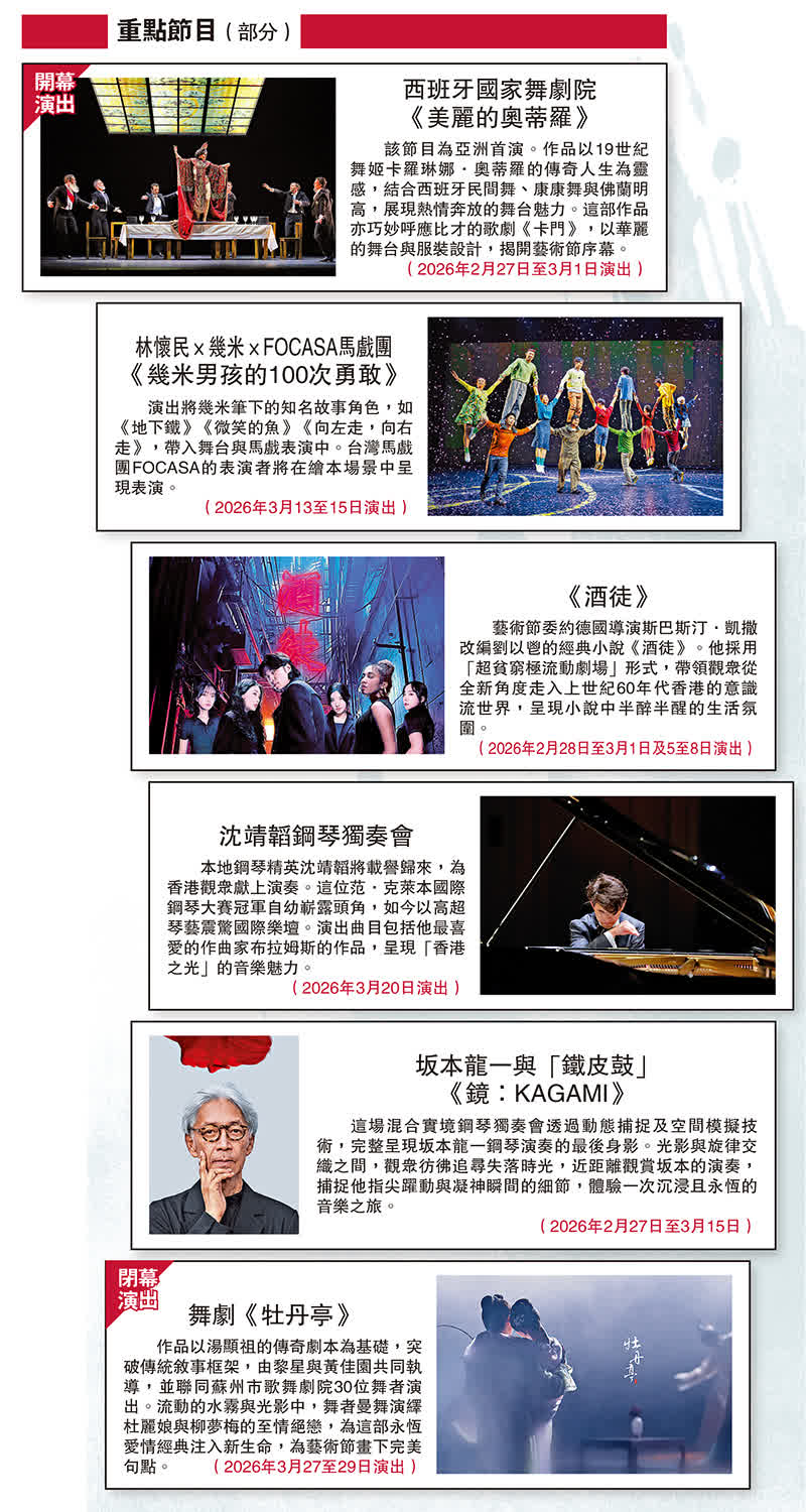 (大公報 記者 郭悅盈)香港藝術節昨日公布2026年第54屆藝術節的節目詳情。藝術節將於2026年2月至3月期間舉行,涵蓋超過20個演出場地,舉行逾170場演出,並配合近300項「加料節目」、社區及教育活動。今年共有逾1100名本地及海外藝術家及製作人員參與,預計將推出約10.5萬張門票,延續藝術節一貫的國際視野與多元風貌。