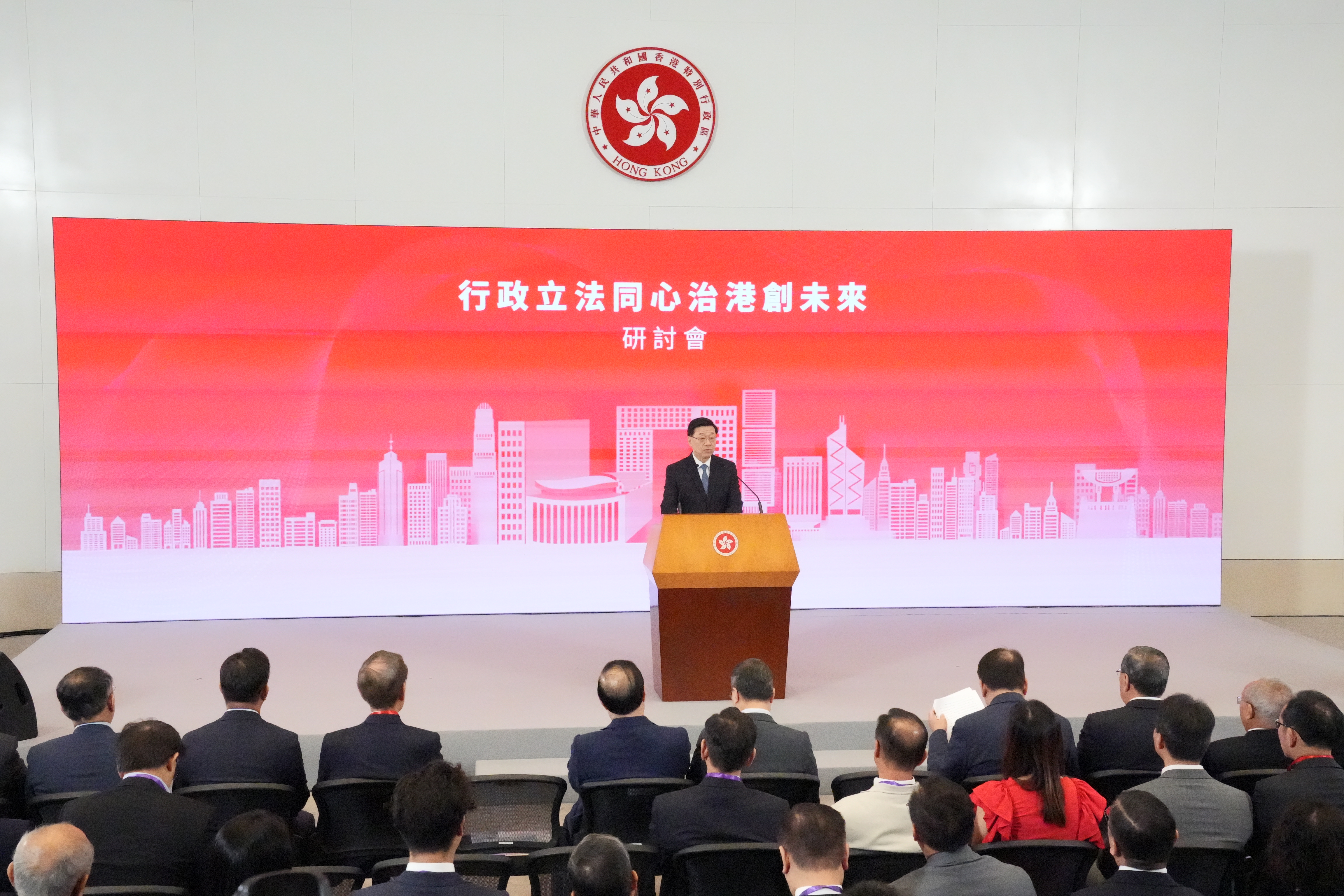 大公文匯全媒體報道,為加深社會大眾對行政立法機關相互促進,對「一國兩制」行穩致遠以至特區良政善治重要性的認識,特區政府今日(16日)於政府總部舉辦「行政立法同心治港創未來」研討會,邀請愛國愛港團體、社會各界代表,以及專家學者共同交流真知灼見,凝聚共識。行政長官李家超在研討會作主旨發言,政務司司長陳國基、立法會主席梁君彥、香港再出發大聯盟秘書長譚耀宗,以及全國港澳研究會顧問劉兆佳教授作專題演講。