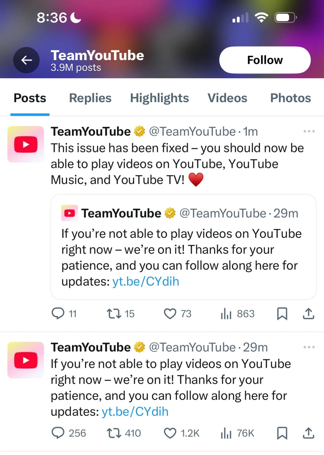 YouTube當日稍晚在X上公布,用戶現在應該能夠在YouTube Music、YouTube TV及其主平台上播放影片,但沒有具體說明導致問題的原因。