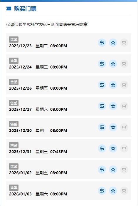 大公文匯全媒體報道,今年12月,「歌神」張學友將重返紅館演出8場《張學友60+巡迴演唱會 香港 終章》,與樂迷共度聖誕節及除夕,迎接2026年的來臨,透過自己的音樂與樂迷歡度佳節。信用卡優先發售已於日前展開,訂票反應熱烈,所有門票已經售罄。公開發售則於今日(16日)上午10時正式開始,大批粉絲準時撲飛,不少人仍然未能成功購票,據城市售票網顯示,門票已火速售罄,絕對是一票難求。