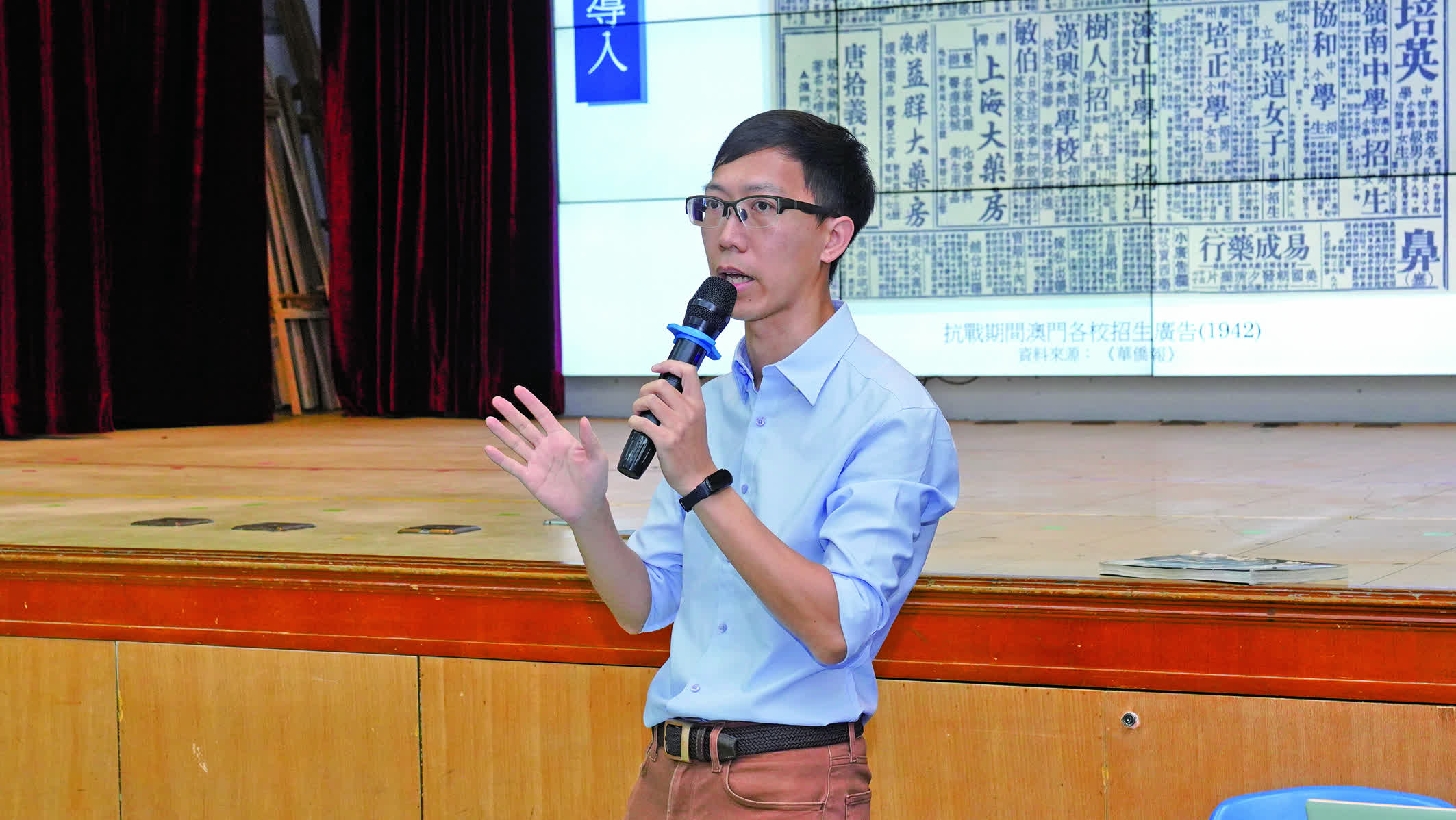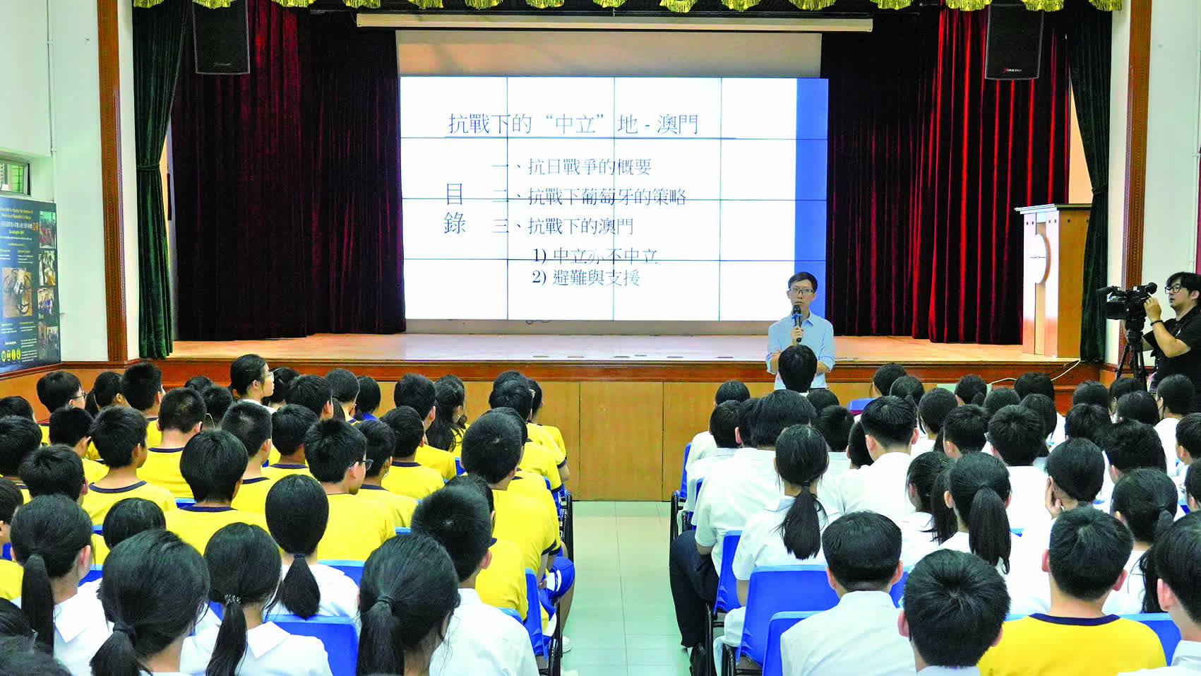 新學年伊始,澳門培道中學組織逾百名初中學生上了「開學第一課」,該校歷史科老師何其庭透過「抗戰與澳門」教學課件,向學生介紹澳門在中國抗戰歷史中的獨特作用。