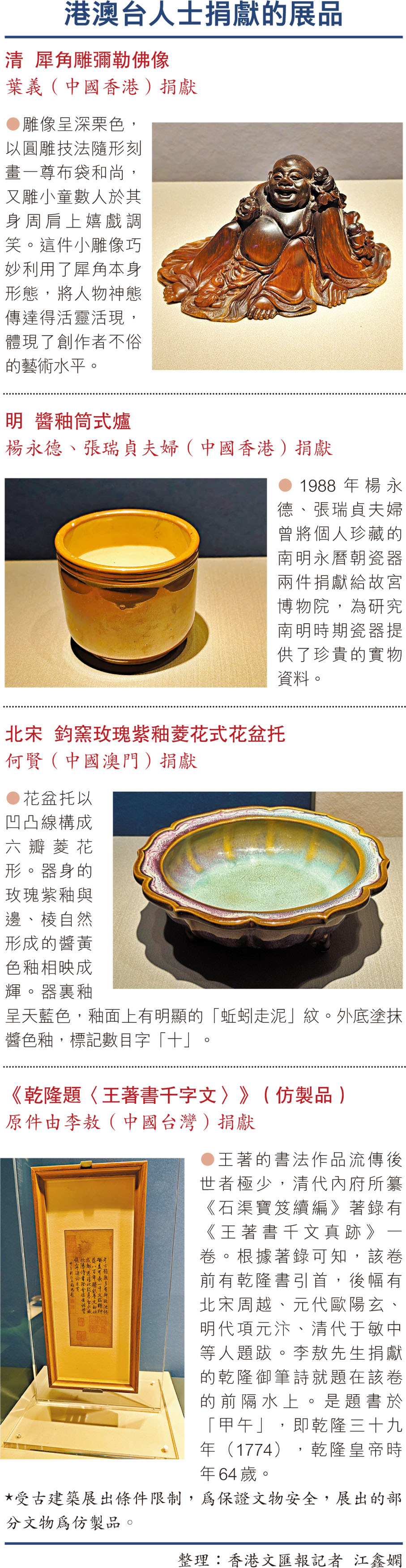 香港著名醫生、文物收藏家葉義捐贈的一件清代犀角雕彌勒佛像是重點展品之一。雕像呈深栗色,以圓雕技法隨形刻畫一尊布袋和尚,袒胸露腹,赤足曲肱,開口大笑,神情慈祥,右手持桃,斜倚布袋而坐。又雕小童數人於其身周肩上嬉戲調笑。這件小雕像巧妙利用了犀角本身形態,將人物神態傳達得活靈活現,體現了創作者不俗的藝術水平。同在一個展櫃中的還有一件明代的醬釉筒式爐,由香港收藏家楊永德、張瑞貞夫婦捐獻。1988年他們將個人珍藏的南明永曆朝瓷器兩件捐獻給故宮博物院,為研究南明時期瓷器提供了珍貴的實物資料。