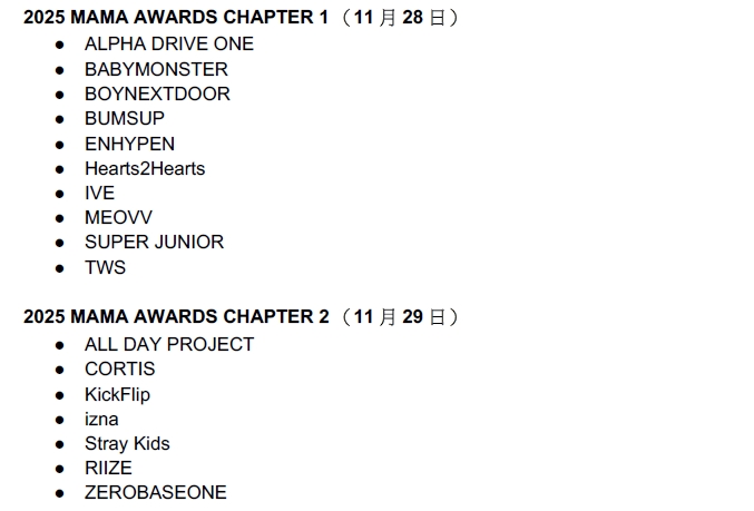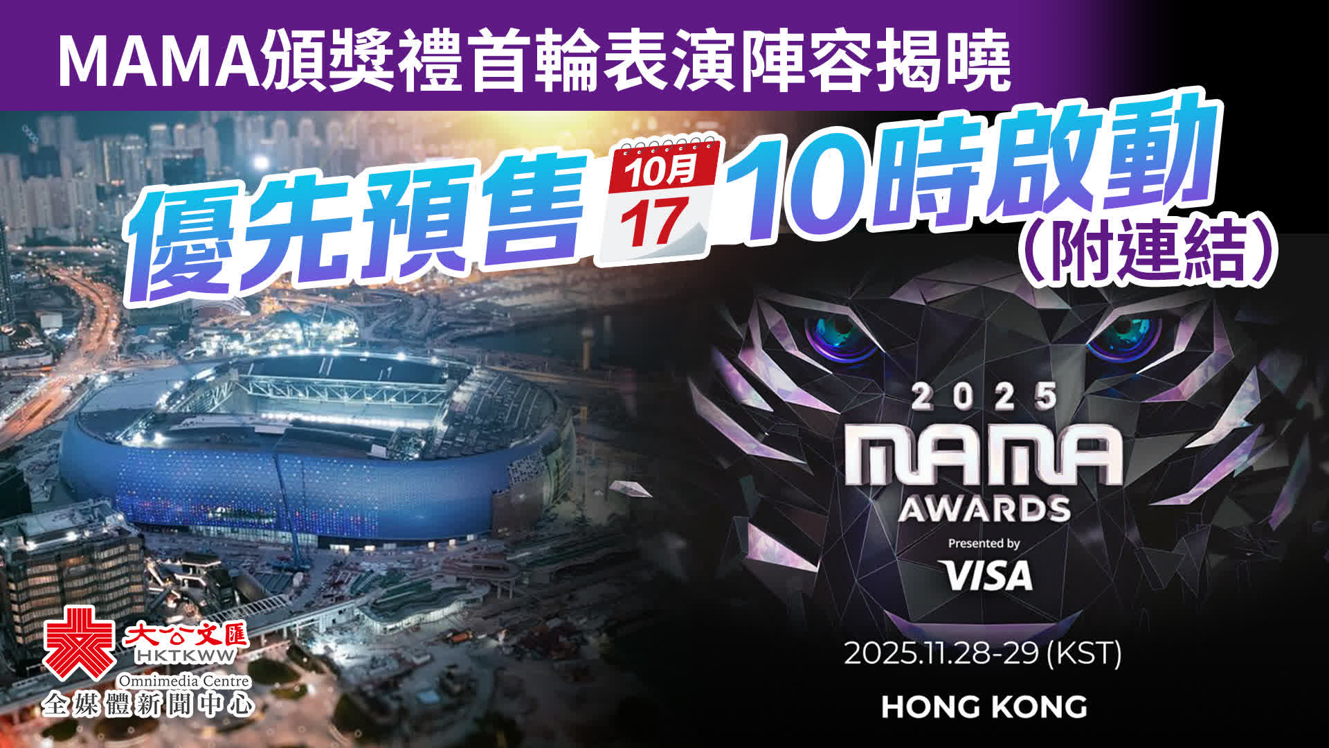 大公文匯全媒體報道,全球領先的娛樂公司CJ ENM今日(17日)公布2025 MAMA AWARDS首輪表演陣容,涵蓋資深偶像與實力新人,呈現豐富多元的K-POP演出。全球第一K-POP頒獎典禮將於11月28日起一連兩日在香港舉行。