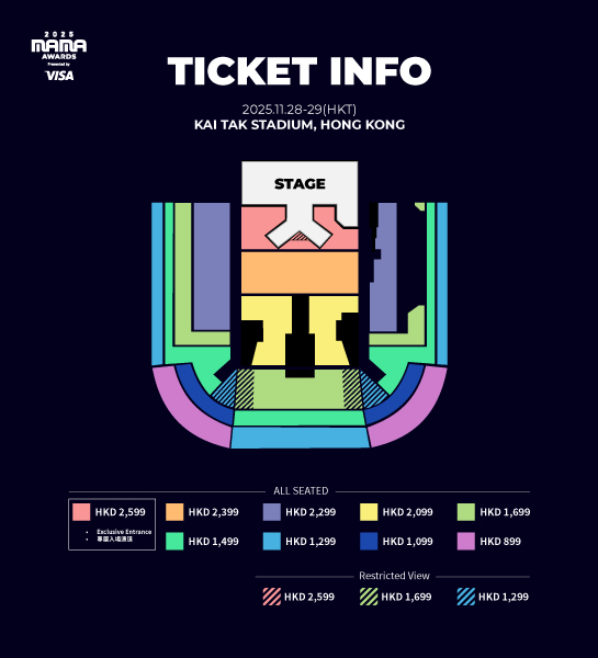 2025 MAMA AWARDS門票設多種預售及公開發售。Visa Infinite預售將於10月17日上午10時至下午2時(香港時間)進行,Visa預售則於10月17日下午6時起至10月18日下午2時(香港時間)進行,均透過Cityline平台發售。(點此購票)一般售票將於10月20日上午10時(香港時間)起開賣,售票平台包括:Cityline、 大麥網、Trip.com以及 Qoo10。