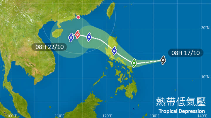 大公文匯全媒體報道,天文台今日(17日)表示,位於菲律賓以東海域的低壓區已增強為熱帶低氣壓。在上午10時,該熱帶低氣壓集結在馬尼拉以東約1130公里,預料向西移動,時速約30公里。天文台預測,該熱帶氣旋會在今明兩日靠近呂宋一帶並逐漸增強,隨後進入南海東北部,受東北季候風影響而逐漸轉向西南方向移動並開始減弱,但轉向的時間及地點存在變數。在季候風及該熱帶氣旋的共同效應下,下周初至中期華南沿岸風勢頗大及有雨,氣溫顯著下降,海有湧浪。