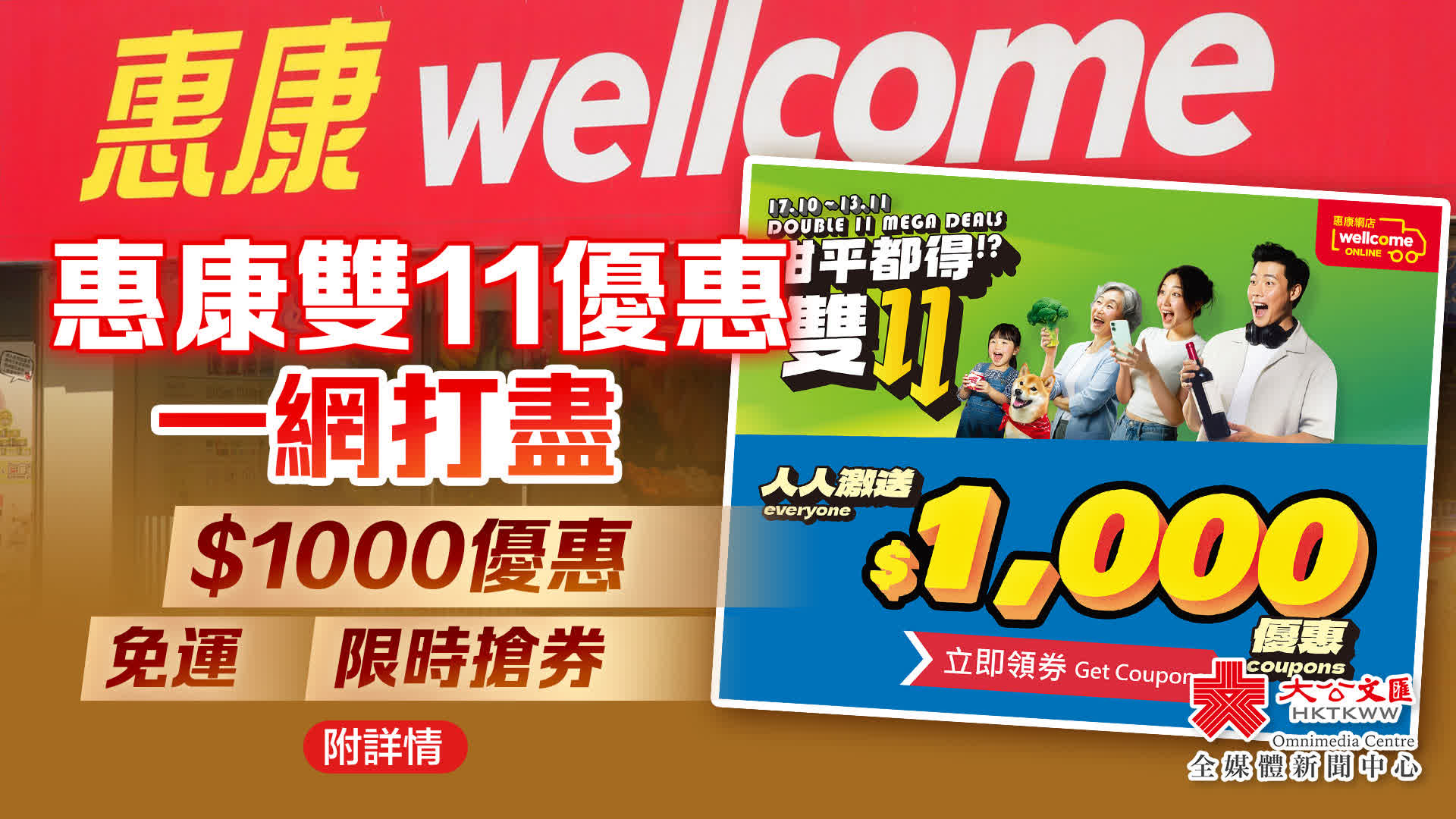 大公文匯全媒體報道,惠康/Market Place網店雙11優惠今年再度歸來,一連4周為市民送上多款驚喜!首輪人人激送$1,000優惠,新客更Double送$2,000;首單買滿$360即減$50兼免運費,完成訂單再送多$50優惠券。同步更推出限時激抵優惠,包括45款人氣貨品$11起、精選貨品$111/3件或$111/4件自由配搭,超着數優惠,讓你抵上加抵!