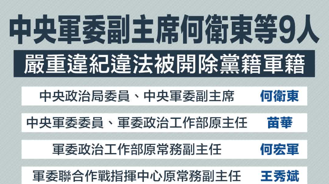 張曉剛表示,黨的十八大以來,全軍和武警部隊堅決貫徹黨中央、中央軍委決策指示,堅持無禁區、全覆蓋、零容忍,重拳懲貪肅腐,軍隊反腐敗鬥爭不斷向縱深推進。經黨中央、中央軍委批准,中央軍委紀委監委陸續對中央政治局委員、中央軍委副主席何衛東,中央軍委委員、軍委政治工作部原主任苗華,軍委政治工作部原常務副主任何宏軍,軍委聯合作戰指揮中心原常務副主任王秀斌,東部戰區原司令員林向陽、陸軍原政委秦樹桐、海軍原政委袁華智、火箭軍原司令員王厚斌、武警部隊原司令員王春寧9人立案審查調查。經查,這9人嚴重違反黨的紀律,涉嫌嚴重職務犯罪,數額特別巨大,性質極為嚴重,影響極其惡劣,依據相關黨內法規和法律法規,黨中央決定給予9人開除黨籍處分,將涉嫌犯罪問題移送軍事檢察機關依法審查起訴。其中,給予何衛東、苗華、何宏軍、王秀斌、林向陽、秦樹桐、袁華智、王春寧8名中央委員開除黨籍處分,待召開中央委員會全體會議時予以追認。此前,中央軍委已決定給予以上9人開除軍籍處分。