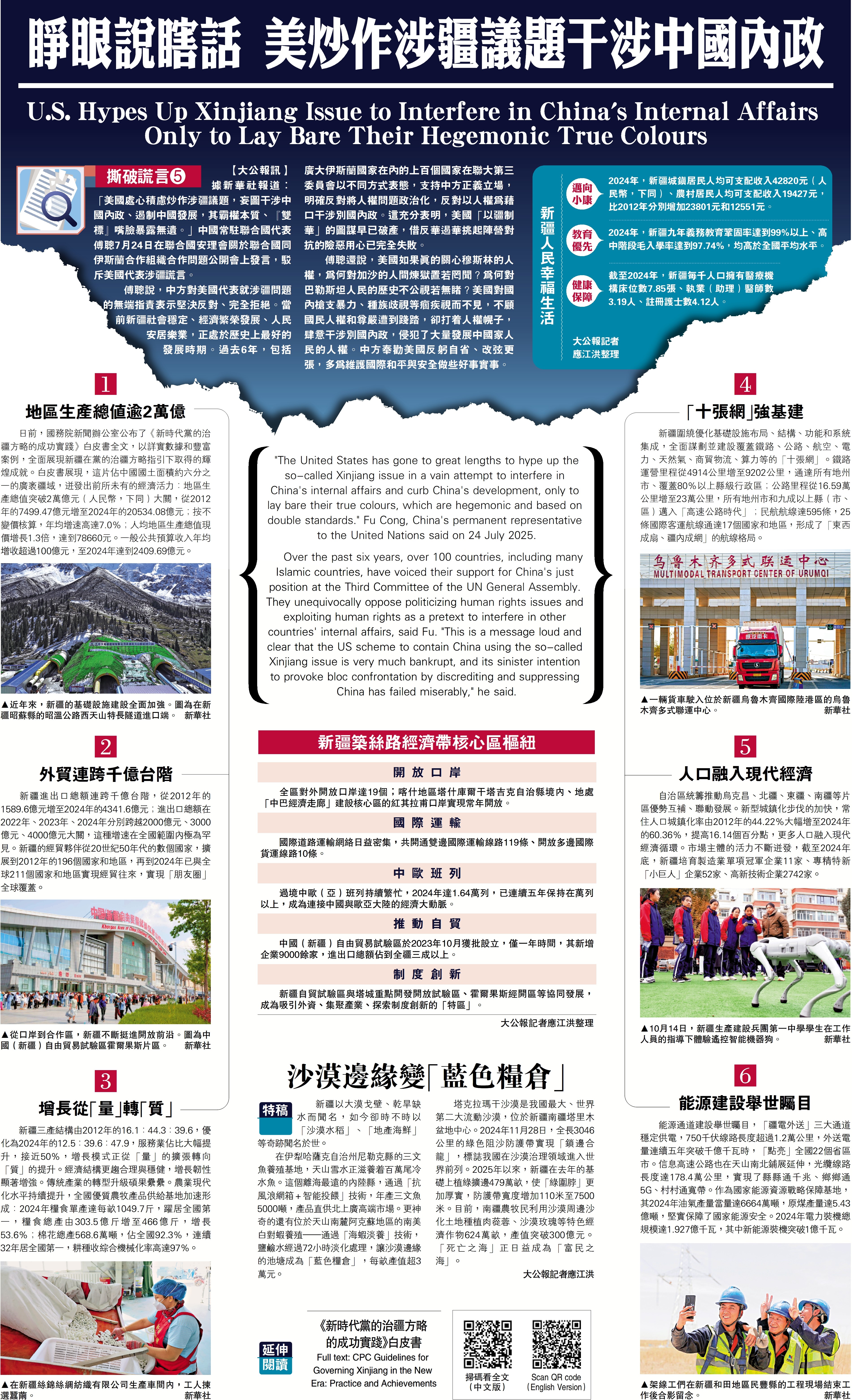 大公報援引新華社報道,「美國處心積慮炒作涉疆議題,妄圖干涉中國內政、遏制中國發展,其霸權本質、『雙標』嘴臉暴露無遺。」中國常駐聯合國代表傅聰7月24日在聯合國安理會關於聯合國同伊斯蘭合作組織合作問題公開會上發言,駁斥美國代表涉疆謊言。