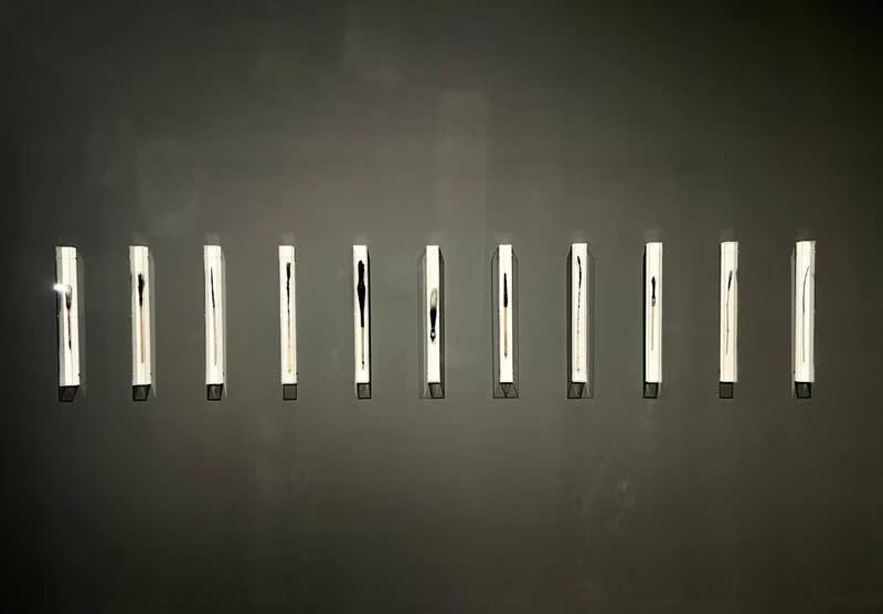 展覽第一板塊是造筆,傳統制筆講究「尖齊圓健」的實用標準,而石虎卻反其道而行——他突破「尖齊圓」的束縛,採用孔雀毛等制筆,形成不可控的效果。這或許也體現了石虎文化尋根與回歸「造筆之初」的理念:唯有改變工具,才能解放筆法,進而展現當代人對線條與空間的獨特理解。