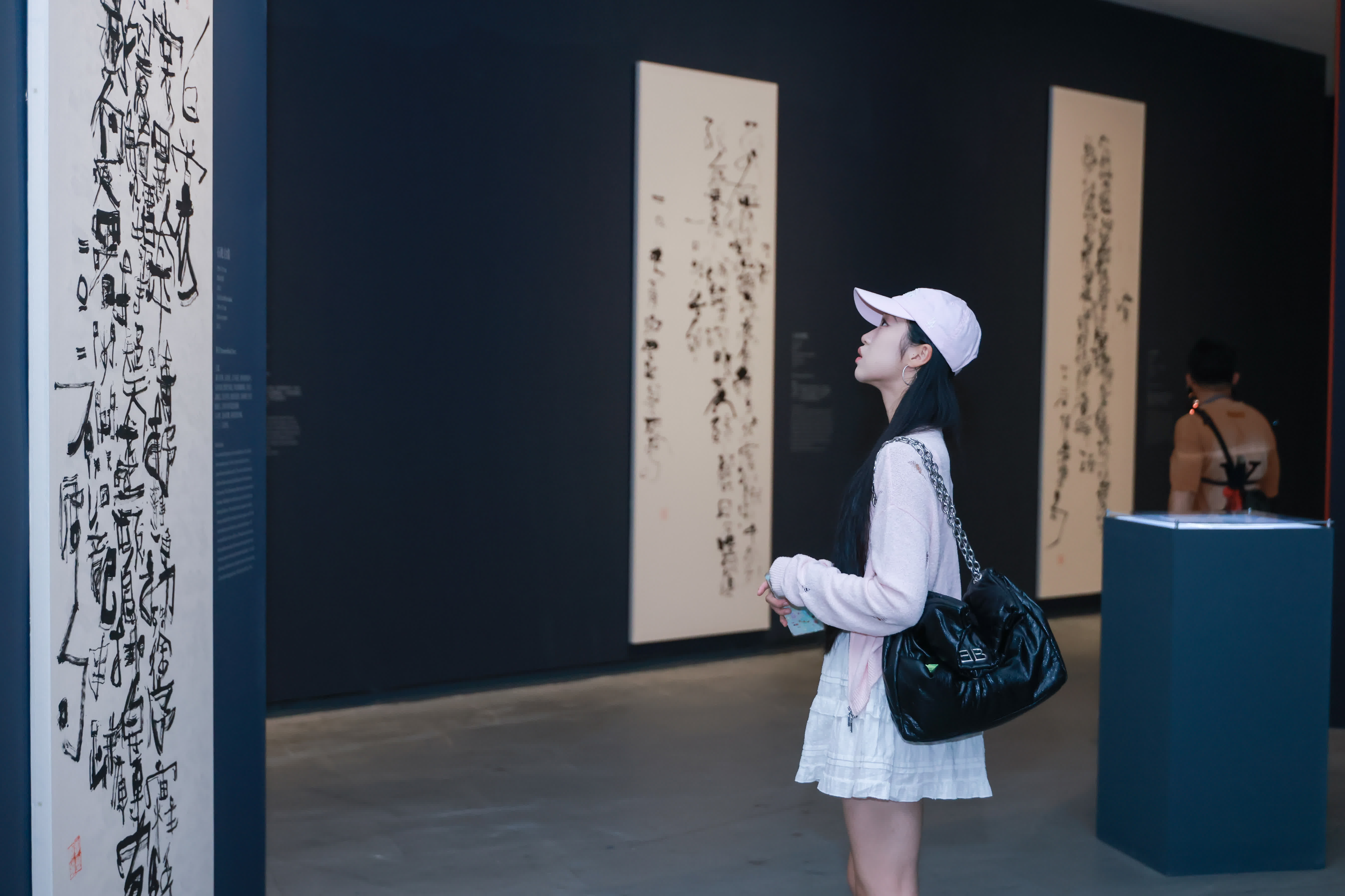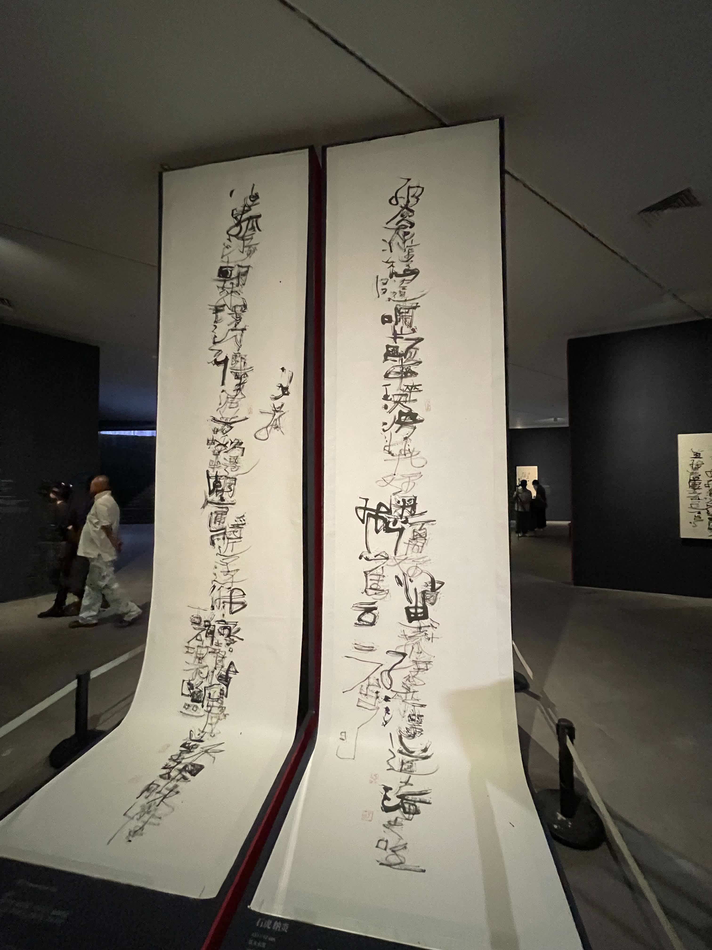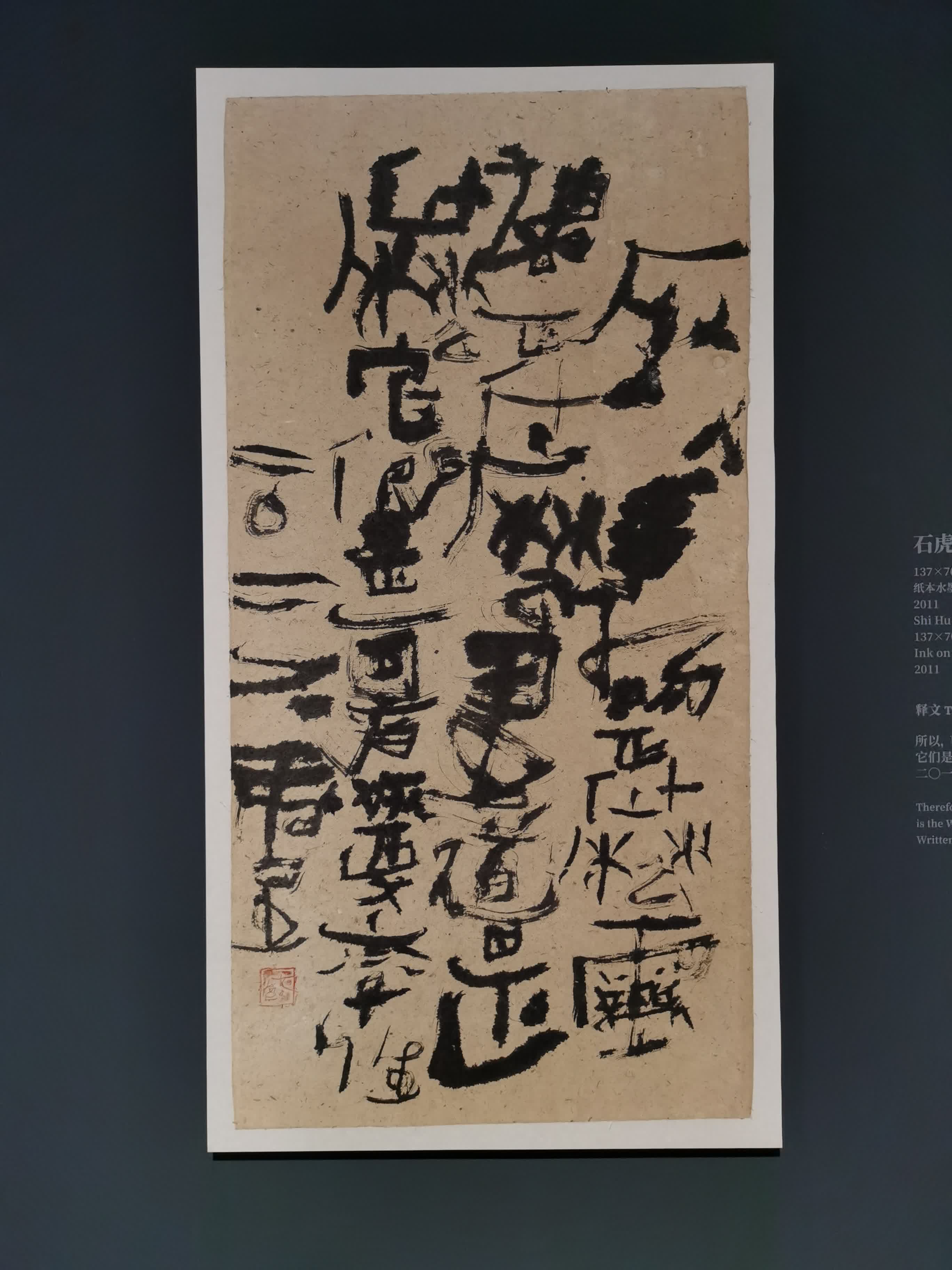 選擇以「石虎書」而非「石虎書法」命名展覽,正契合了藝術家不願被傳統名詞定義的立場。在展覽現場,一些展櫃中的手稿正呈現了石虎對傳統書法的深厚功力,從中可以看到「二王」、顏魯公以及漢魏書法的影響。相形之下,牆上的巨幅書法中,無論是《信天遊》,還是《海念》《卉毫》《燭紙》等作品,一些字則幾乎不可辨識,然而當中透出的氣勢與力量、生命的掙扎清晰可見,彰顯出石虎的「兩個回到」——回到「造筆之初」和回到「造字之初」,這構成了他藝術道路的兩大支柱。