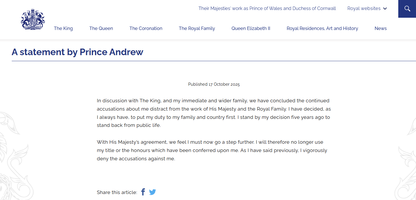 他在聲明中表示,「經過與英國國王查爾斯三世及直系親屬和更廣泛的王室成員商議,我們認為持續針對我的指控會干擾國王和王室的工作。」因此,他將不再使用「約克公爵」這一由其母親授予的頭銜及其他榮譽,但仍保留王子身份,他的兩個女兒也仍保留公主身份。