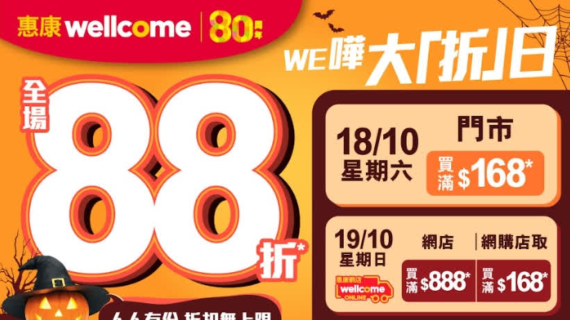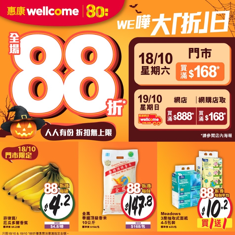 惠康更貼心地推出「萬聖節狂歡優惠」,涵蓋多款精選商品,包括茶類飲品、啤酒、薯片、水果、香米、衞生紙等,無論是籌備狂歡派對還是日常補貨,消費滿指定金額,即享全單88折: