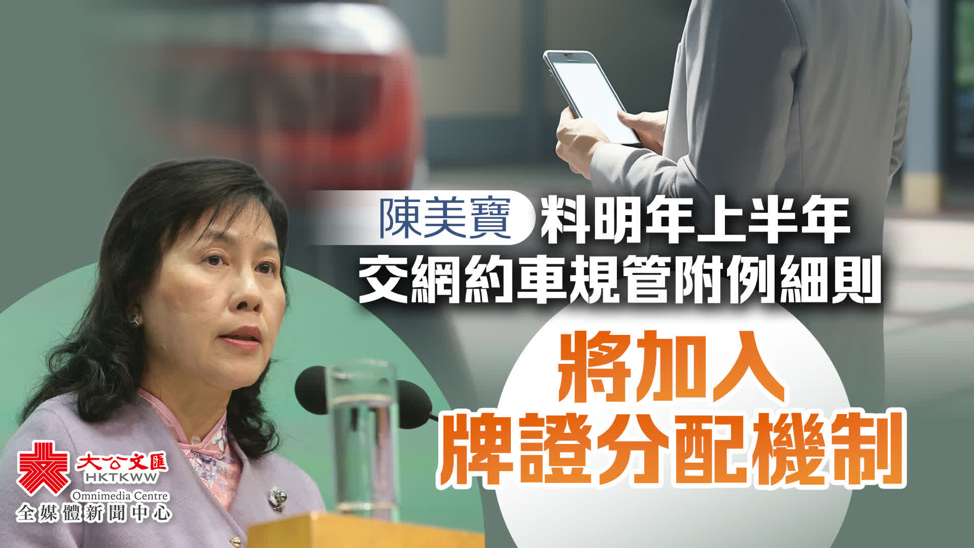 大公文匯全媒體報道,立法會周三(15日)三讀通過《2025年道路交通(修訂)(網約車服務)條例草案》,預計持牌網約車平台最快明年第四季營運。運輸及物流局局長陳美寶今日(18日)在電台節目表示,當局會避免過分監管網約車,以免窒礙市場發展。她透露當局正籌備細化網約車平台的監管和入場門檻,運輸署亦將於下月推出全新簡化版的士筆試考核,考核與網約車司機牌證考核互通,當局將在附屬法例細則加入網約車總額限制及牌證分配的機制及方式,料明年上半年提交立法會,並於明年年中完成所有立法過程。
