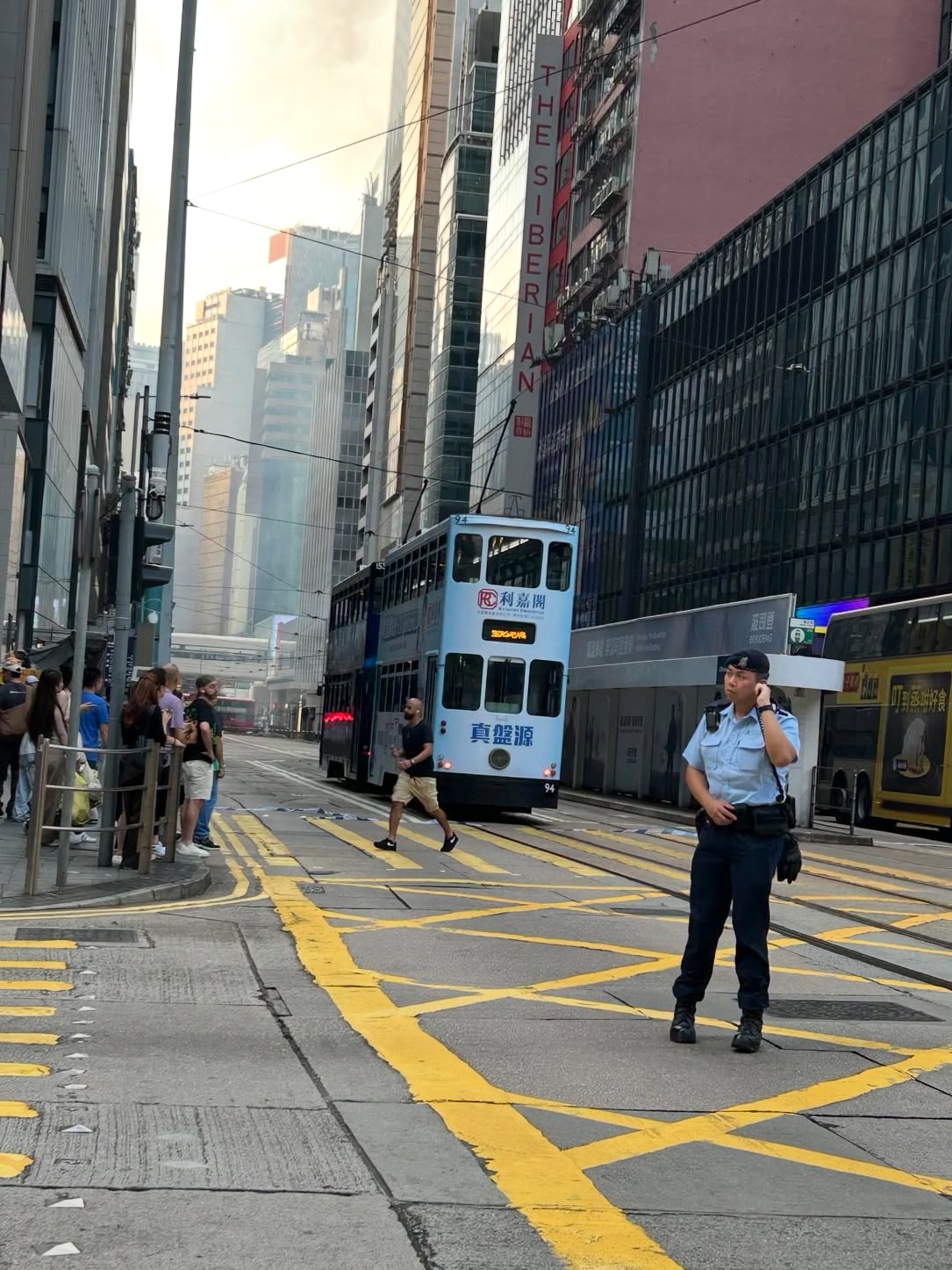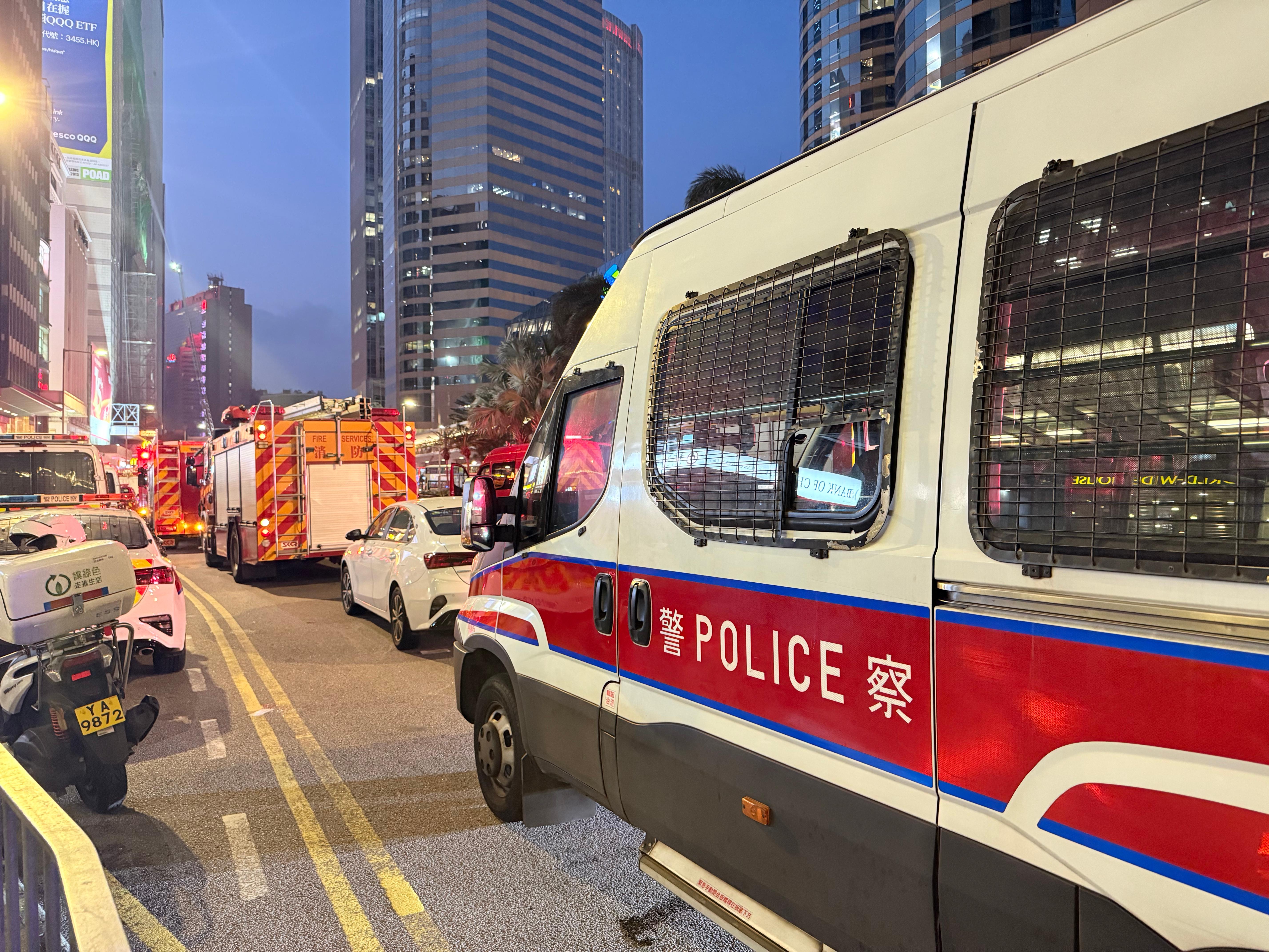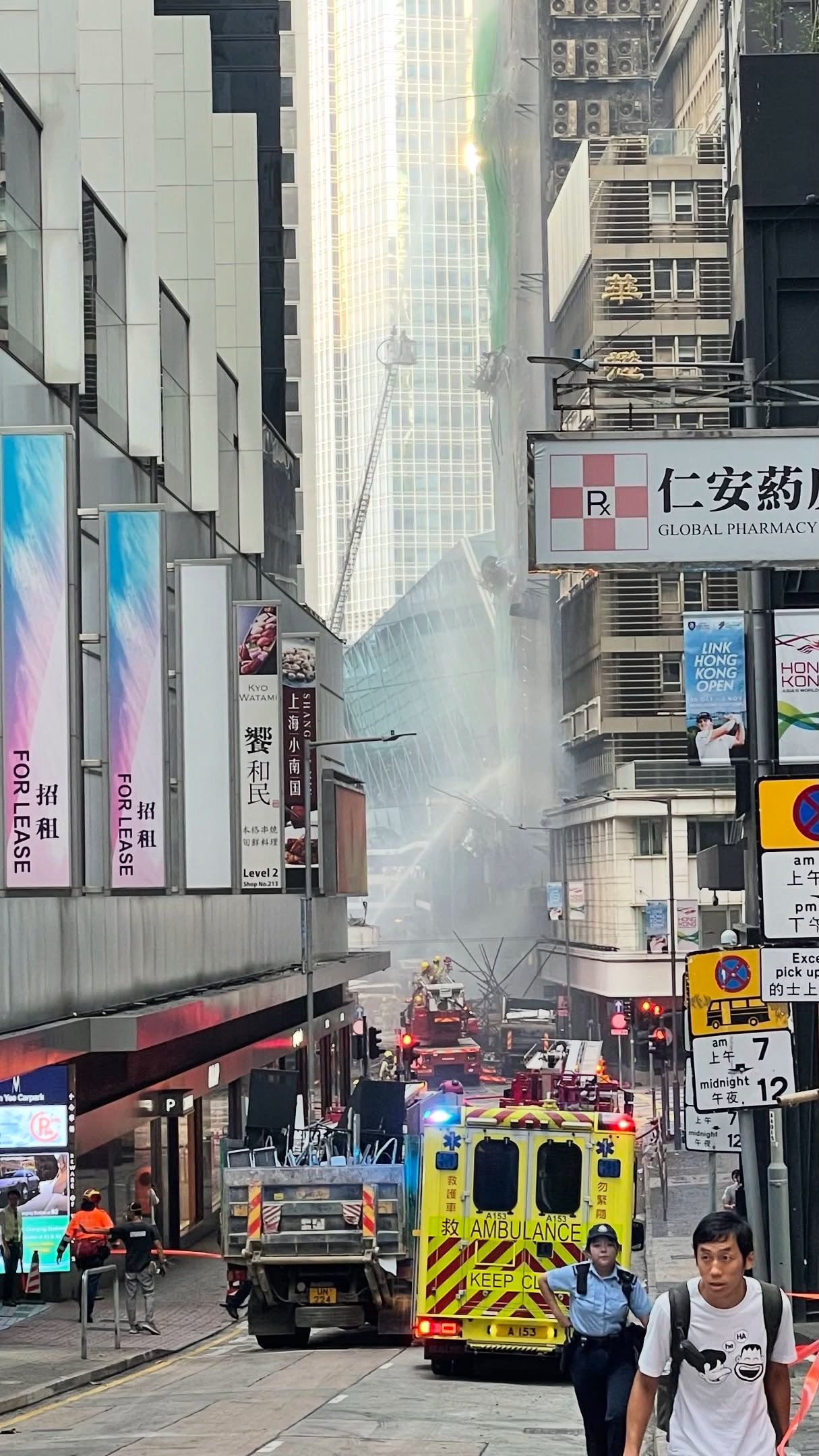 大公文匯全媒體記者在現場看到,起火地點旁邊的德輔道中也已拉起警戒線,人行道設柵欄並有警員看守,交通及行人通行受阻。現時德輔道已封路,車輛無法通過,提醒市民繞行。干諾道中擠滿警車、消防車、救護車,極其擠塞。