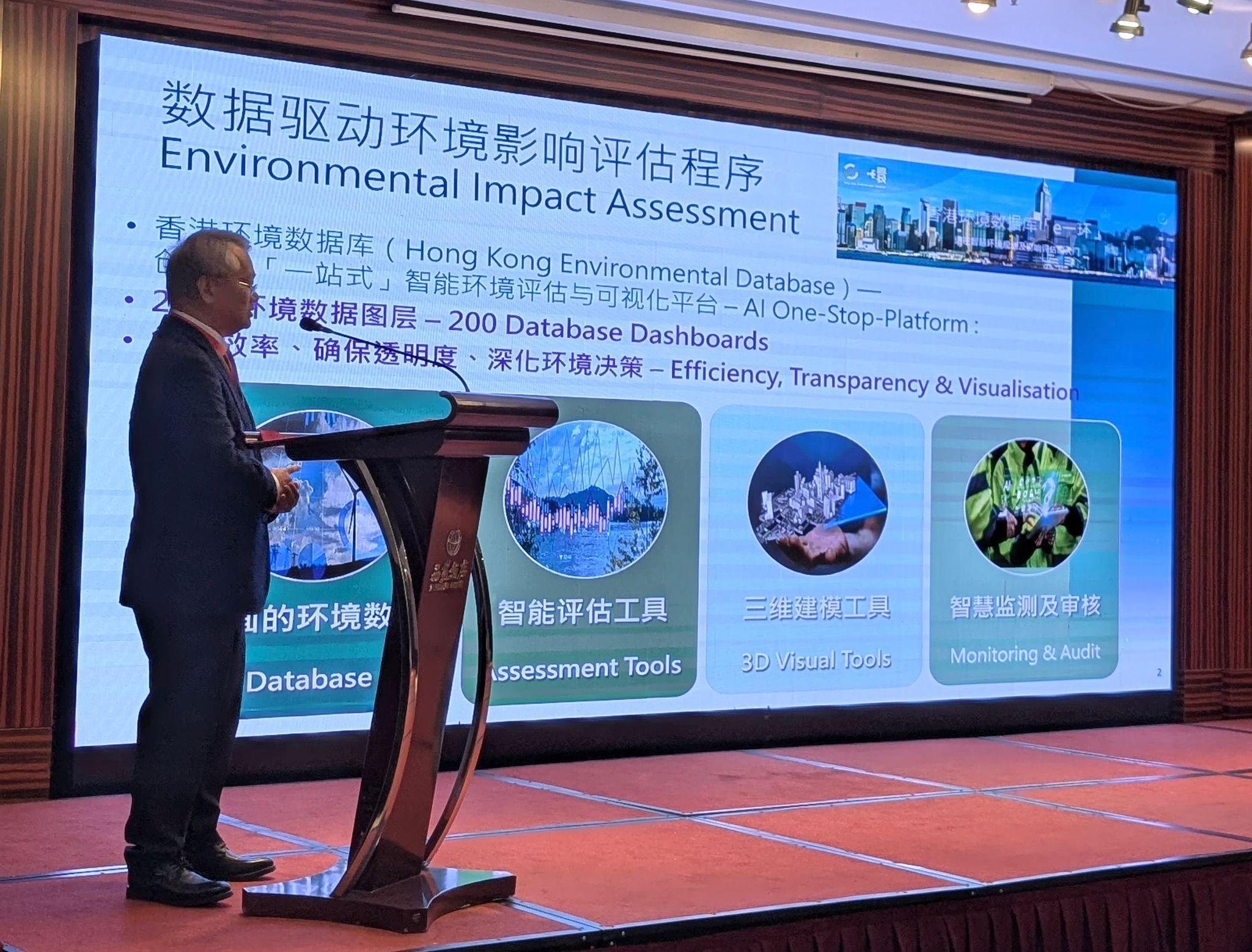 環保署署長徐浩光博士亦有出席大會,並在下午以「共建美麗城市,賦能綠色基建新未來」為題的分論壇作主題發言,介紹由環保署建立的香港環境數據庫,展示如何利用數字賦能環境評估,提升效率。