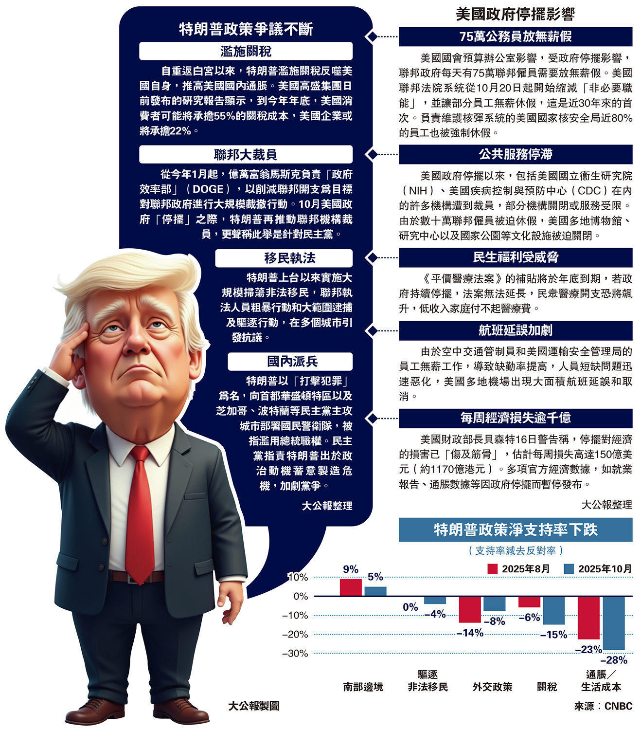 另外,美媒CNBC的調查顯示,特朗普在經濟方面施政的支持度,已從第二季度的46%降至第三季度的44%,創下兩個任期內的最低值,而不支持率上升1個百分點至52%。