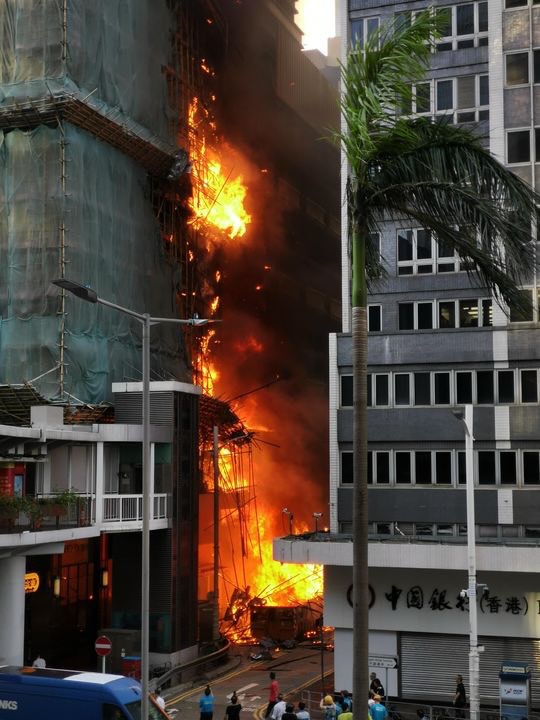 事發昨日下午4時24分,華懋大廈的整幅棚架陷入火海,消防在下午4時36分將大火升為三級火警,出動四隊煙帽隊及動用四條喉灌救。現場火勢猛烈,遠至數公里外的地方都看到濃煙。路面到處是墮下被燒毀的棚竹及灰燼。消防在下午5時46分將火勢控制,至晚上8時許,消防停止射水,出動無人機檢查火場。火警於晚上9時13分大致被救熄。