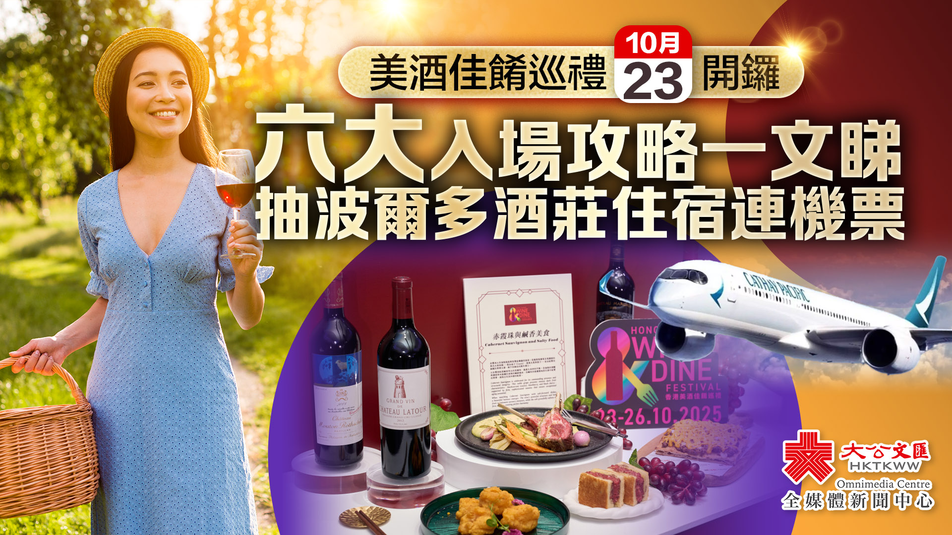 大公文匯全媒體報道,由旅發局舉辦的「香港美酒佳餚巡禮」將於周四(23日)開鑼,一連4日於中環海濱舉行,開放時間更首次延長至午夜12時。今年美酒佳餚巡禮推出全新味覺配對體驗,融合5大葡萄品種與5種滋味,讓入場人士自由搭配多款美食與佳釀,探索創意組合。現場還推出多買多送的幸運大抽獎,有機會贏取波爾多酒莊之旅住宿連來回機票,共4個名額,每份獎品價值5萬元。想盡情暢飲及玩得盡興,即睇以下入場攻略!